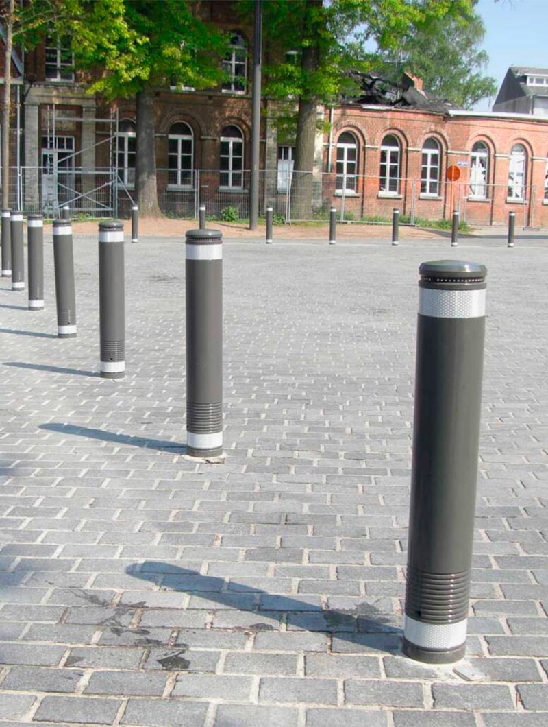 Fabricados en caucho reciclado con núcleo de acero empotrado, ofreciendo gran resistencia a impacto y minimizando posibles daños a peatones o mobiliario