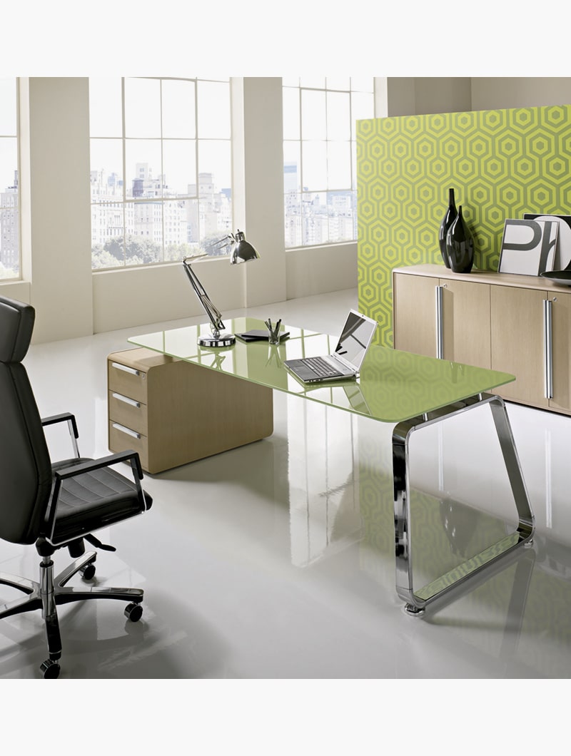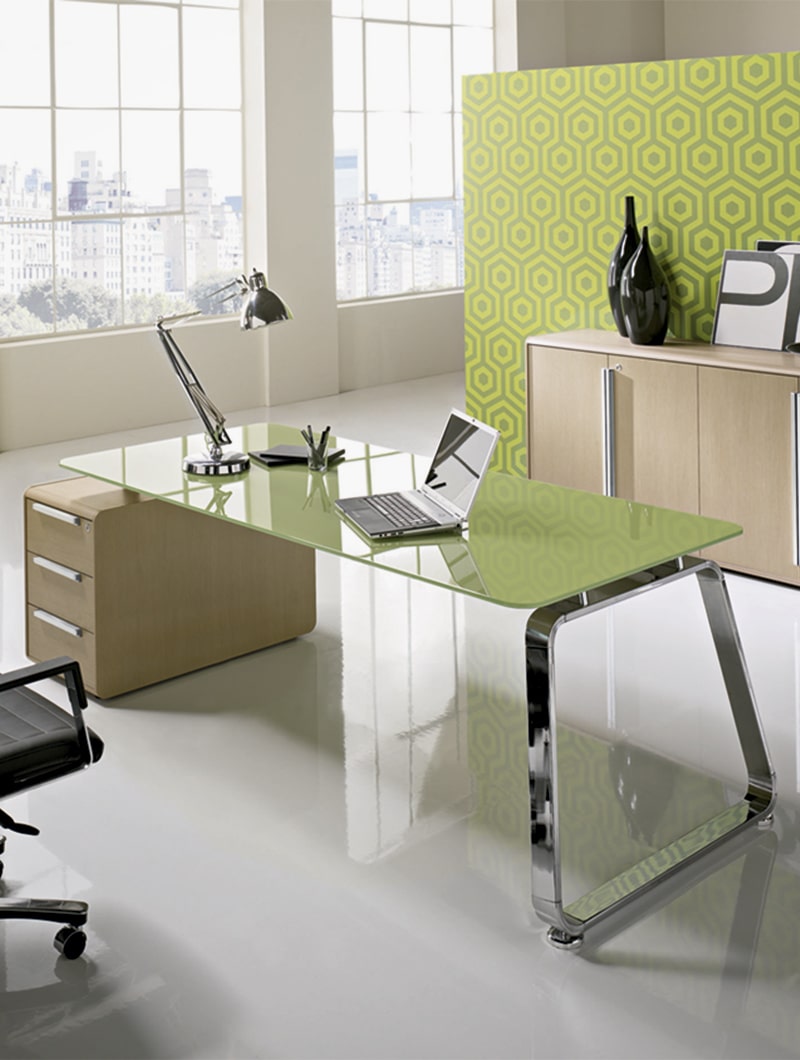 Todas las mesas y cajoneras están disponibles en madera y cristal, en estos colores: