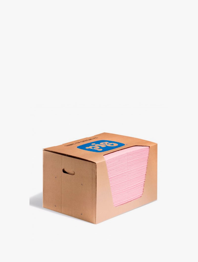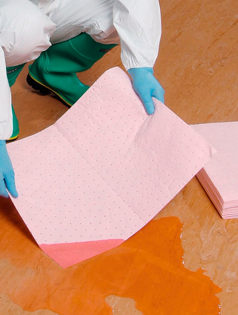 • Absorbe la gama más amplia de líquidos ácidos y cáusticos, incluso aquellos con altas concentraciones como un 98 % de ácido sulfúrico y 30 % de hidróxido de sodio.