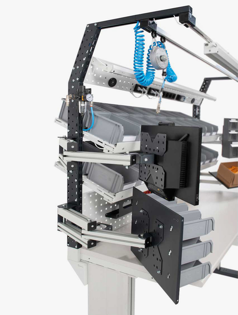 | Composición | Perfil con base para encimera, brazo articulado para perfil, placa porta monitor VESA, panel para Picking Box, barra de acoplamiento con 4 contenedores Picking Box tamaño 1 | Perfil con base para encimera, brazo articulado para perfil, placa porta monitor VESA, panel para Picking Box, barra gancho con 3 contenedores Picking Box tamaño 2, barra de acoplamiento con 4 contenedores Picking Box tamaño 1 | Perfil con base para encimera, brazo articulado para perfil, placa porta monitor VESA, panel para Visual Box, cajonera Visual Box con 5 cajones H=164 mm, cajonera Visual Box con 6 cajones H=112 mm | Perfil con base para encimera, brazo articulado para perfil, bandeja inclinada |