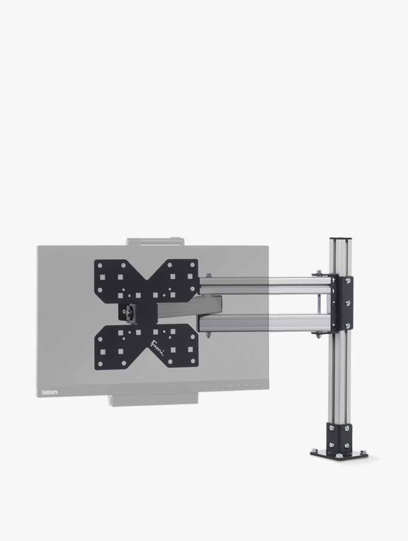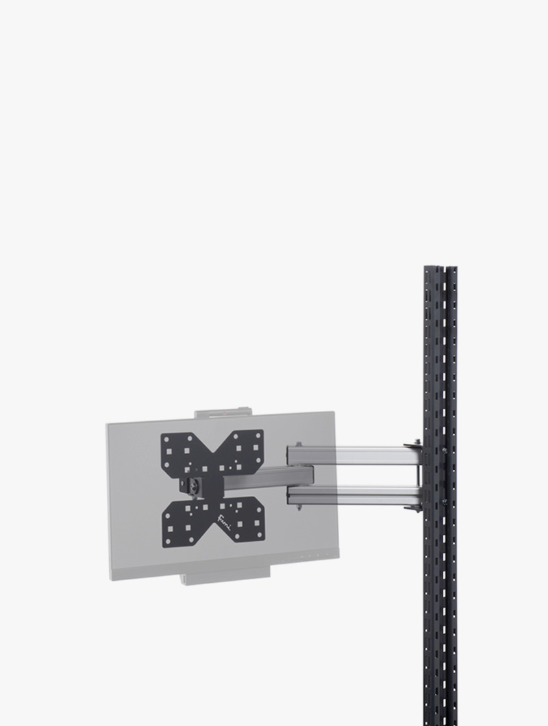 | Composición | Brazo articulado para montante, articulación para placa y bandeja inclinada | Panel perforado/repisa con borde bloquea caja y kit de bisagras para panel perforado | Perfil con base para encimera, brazo articulado para perfil, articulación para placa y placa porta monitor VESA | Perfil con base para encimera, brazo articulado para perfil, articulación para placa, placa porta monitor VESA |