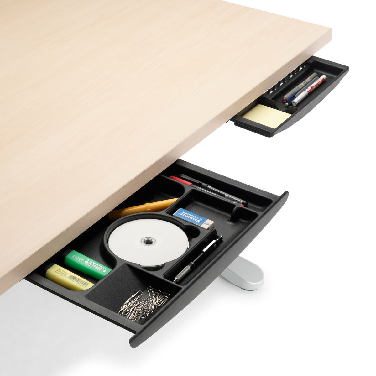 · Cajones de poca altura para guarda todo tipo de material de oficina como clips, bolígrafos, CDs, grapas, gomas de borrar, etc.