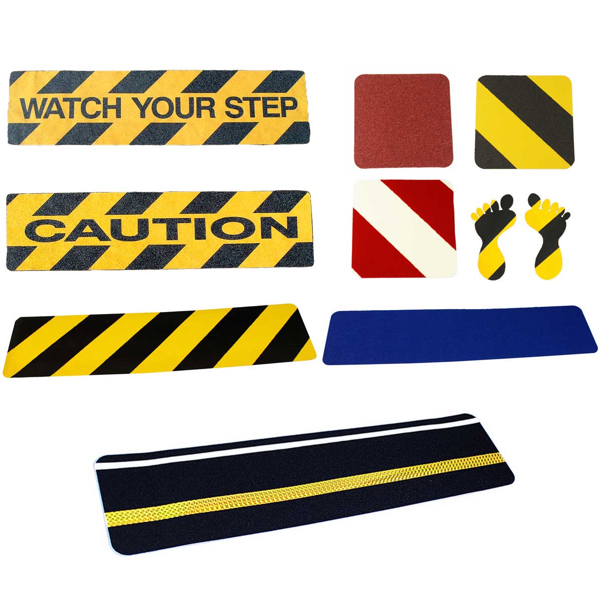 Adhesivos antideslizantes de varias formas y colores para señalizar zonas peligrosas y proporcionar adherencia.