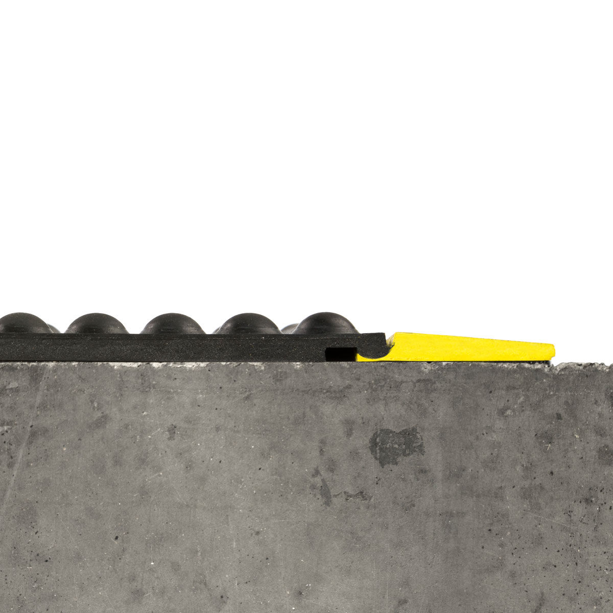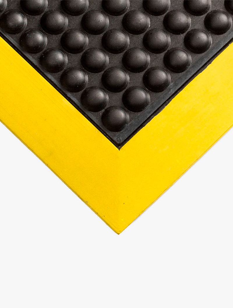 Los bordes biselados y sellados facilitan la transición entre el nivel del suelo y la superficie de la alfombra, minimizando riesgos de tropiezos. Además, puede suministrarse con bordes en color negro o en amarillo, estos últimos ideales para reforzar la visibilidad y la delimitación de las zonas de trabajo.