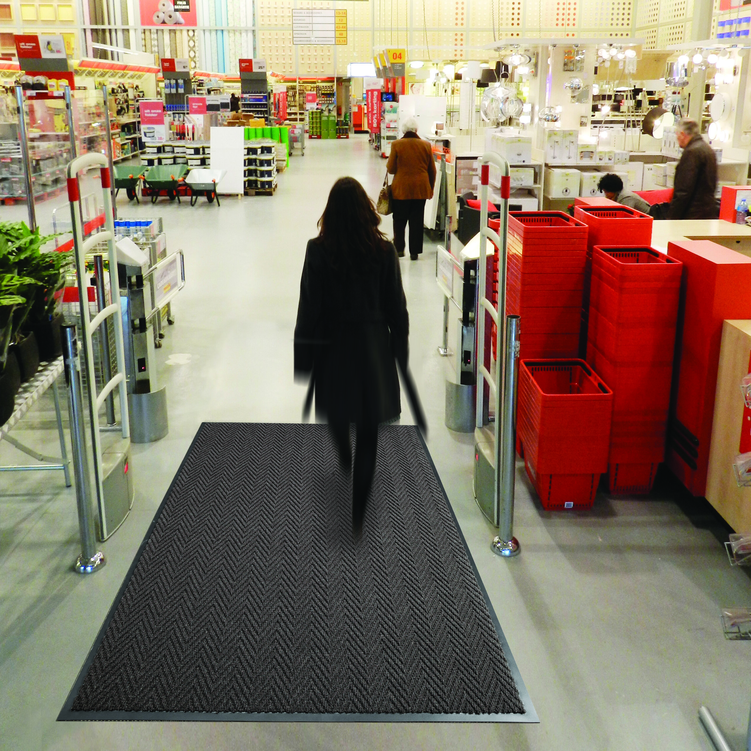 La alfombra para tráfico intenso con fibras está diseñada para ofrecer un rendimiento eficaz en accesos con un elevado volumen de paso, gracias a su estructura de fibras de polipropileno 100% antiestáticas y una base de vinilo resistente y estable. Su superficie presenta un diseño no direccional en forma de flecha, lo que permite una limpieza uniforme en todas las direcciones y una excelente retención de la suciedad procedente del calzado.