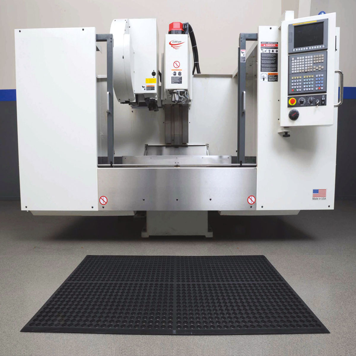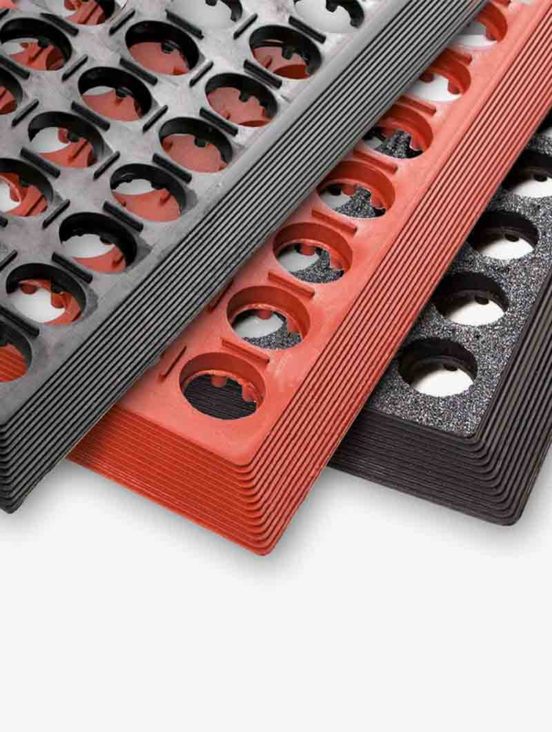 Los bordes biselados aportan una mayor seguridad al evitar tropiezos, mientras que su estructura de drenaje con grandes orificios y un patrón inferior elevado con soportes favorecen el flujo del agua y líquidos bajo la alfombra. Esto garantiza un entorno más limpio y seco, reduciendo riesgos y alargando la vida útil del producto.