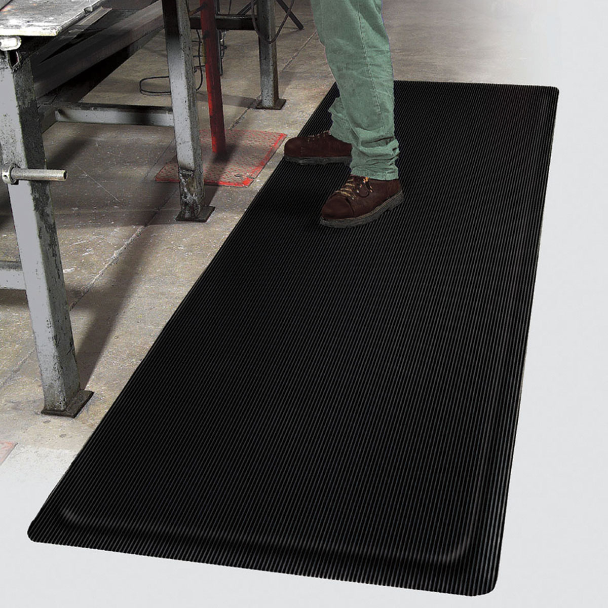 Su diseño combina una superficie de vinilo estriada, que mejora la tracción y facilita la limpieza, con una base de espuma confortable que reduce la presión en pies y piernas, contribuyendo a aliviar la fatiga diaria y a mantener la productividad.