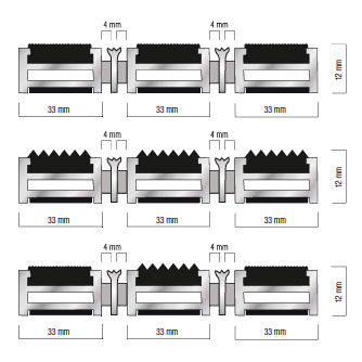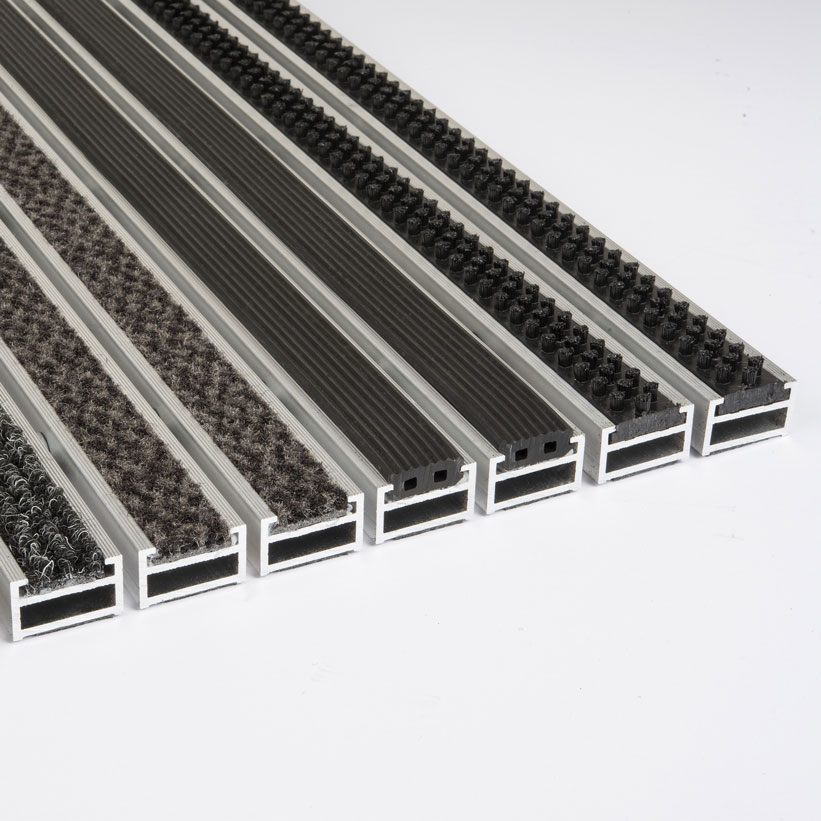 Perfil:la alfombra o se aloja en un perfil de aluminio, de excelente resistencia y son resistentes a todas las condiciones climáticas (+ 90 ° a -50 °).