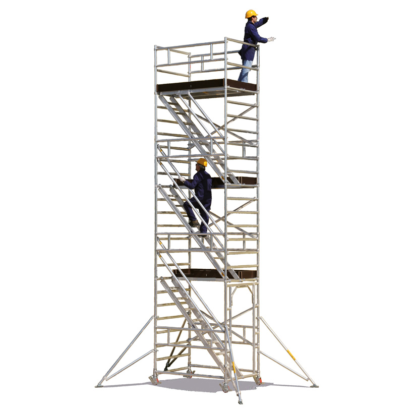 Esta versión del andamio modelo Marte es una opción ergónomica con una escalera interior de 45º con escalones de 100mm de ancho. Cada tramo de escalera interna tiene 2 pasamanos para que el operario pueda subir y bajar de forma segura. Con una plataforma entre pisos a cada final de tramo de la escalera interna se puede trabajar a diferentes alturas con total seguridad y comodidad no solo los operarios sino todos aquellos trabajadores externos a la obra como arquitectos o ingenieros que deban subir por el andamio.