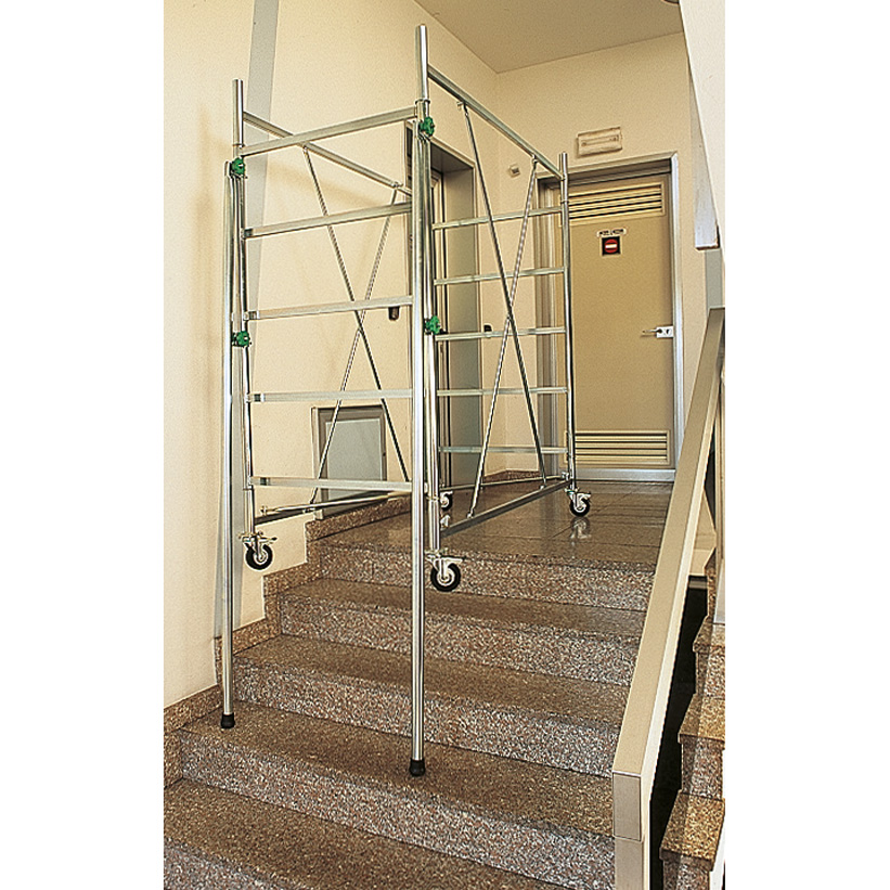 El andamio con ruedas Venus está compuesto de elementos que se pueden insertar entre sí, una forma de conseguir un montaje rápido sin la necesidad de herramientas. Construido con tubos de Ø 38 mm en acero galvanizado en frío FE 360S electrolíticamente para garantizar la máxima resistencia y durabilidad. Con el suplemento de 2 soportes se puede usar en desnivel en las escaleras.