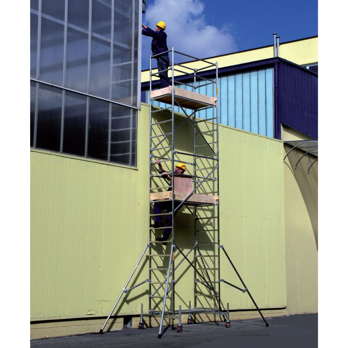 Andamio con estructura tubular de aluminio ligero de diámetro 42mm para uso tanto profesional como doméstico. Sistema modular que permite ir alcanzando más altura a medida que se la van añadiendo más módulos. Apto para alcanzar una altura máxima de 10,18 metros.