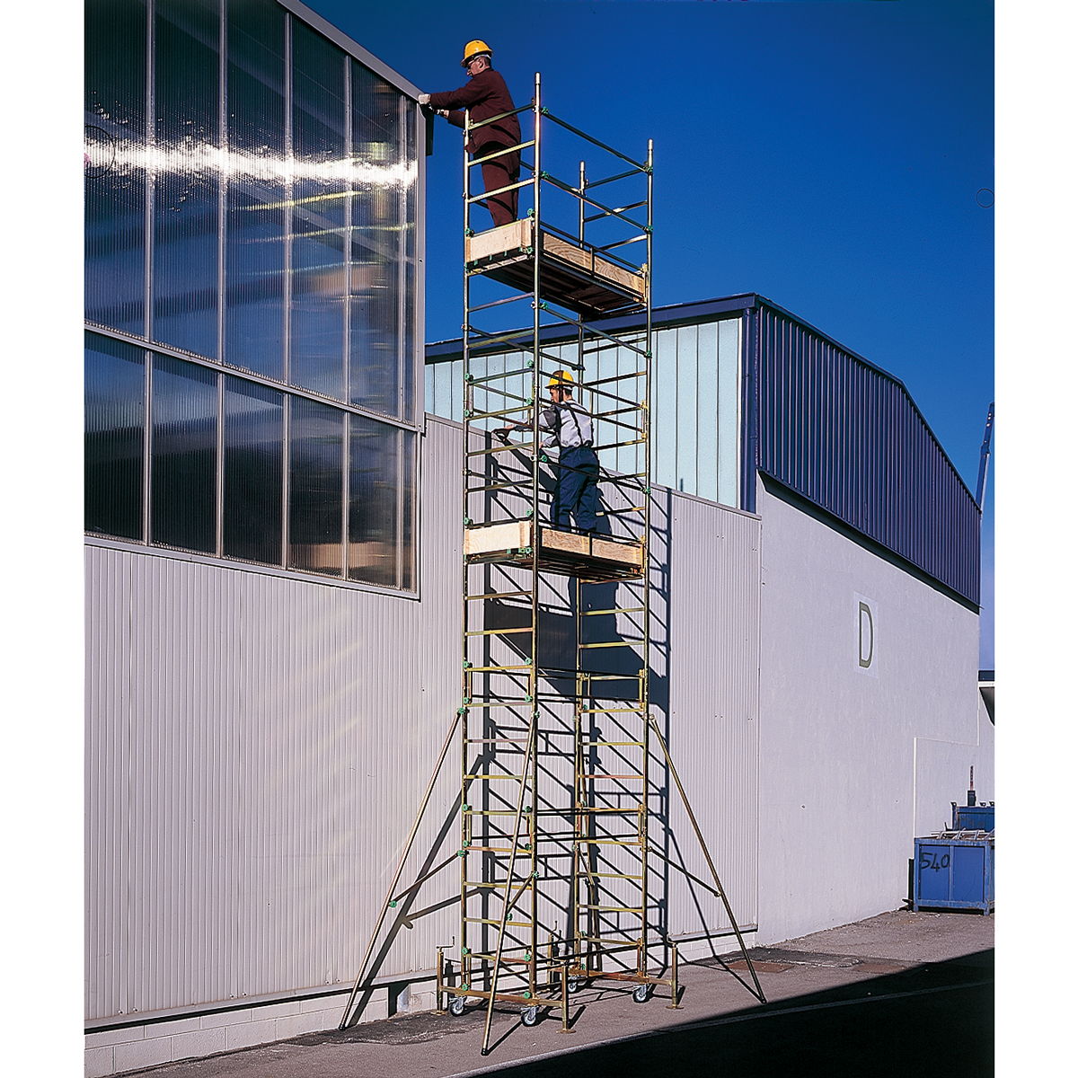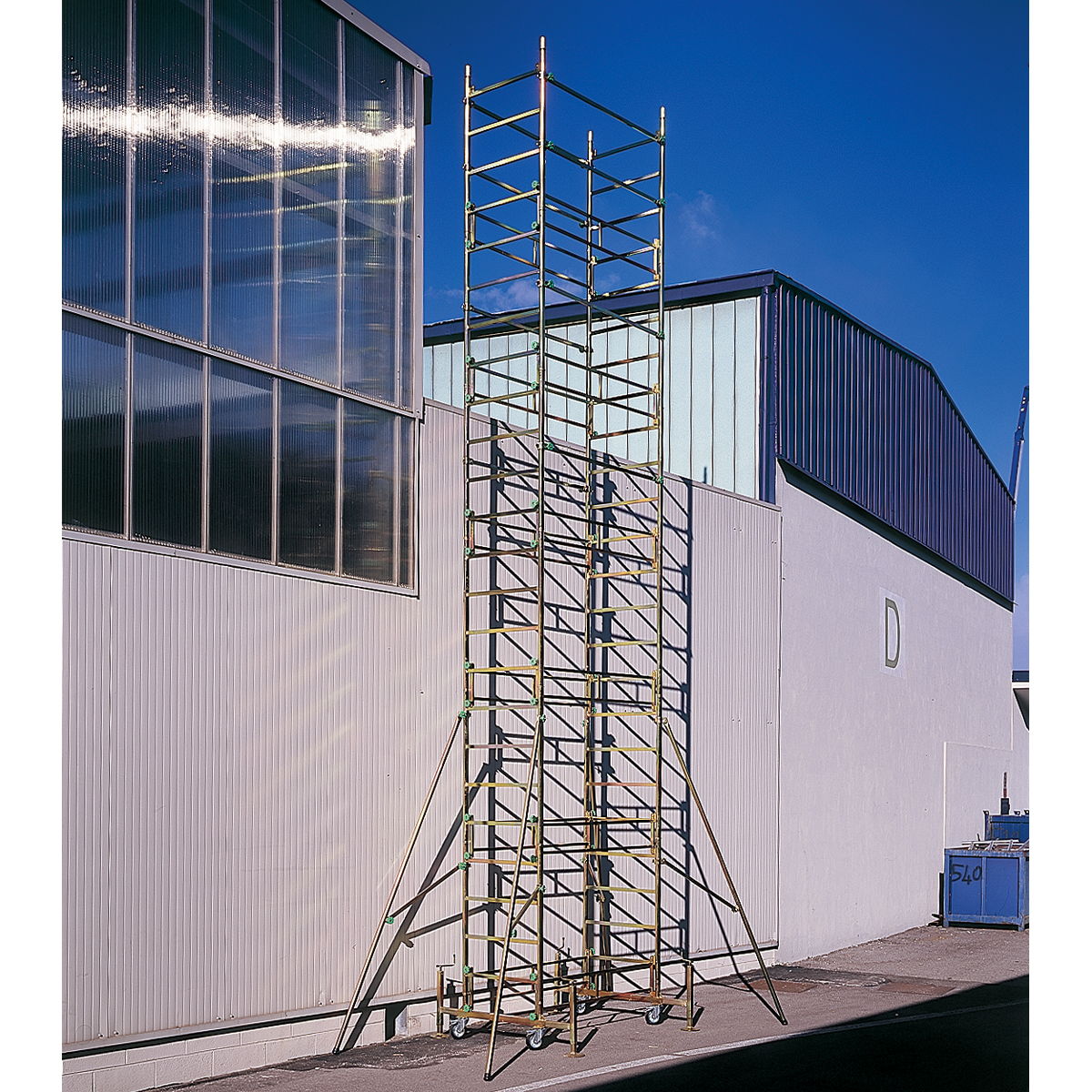 Andamio profesional con estructura tubular de hierro. Sistema modular que permite ir alcanzando más altura a medida que se la van añadiendo más montantes y travesaños. El primer módulo viene equipado con dos travesaños que incluyen 4 ruedas giratorias con freno de pie.