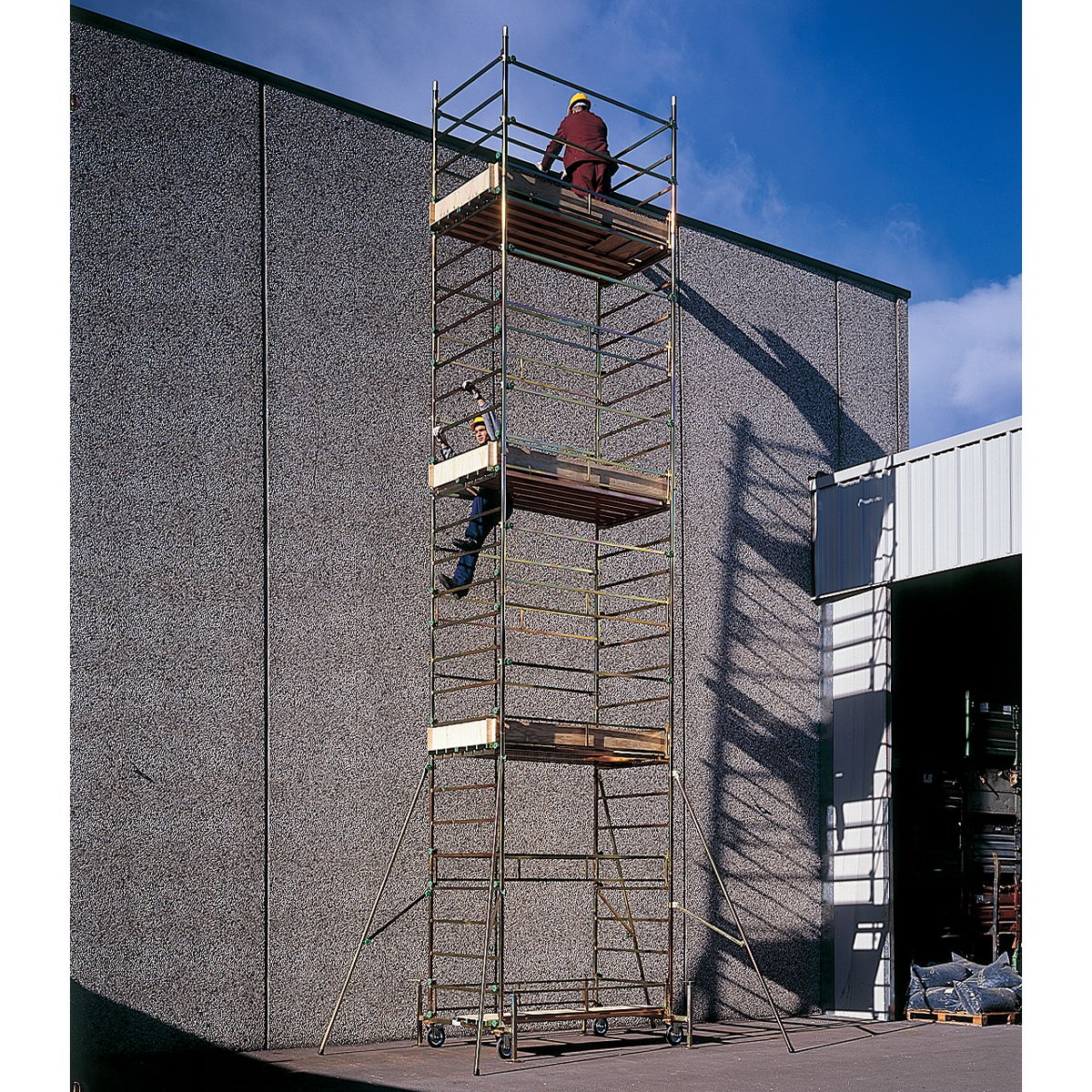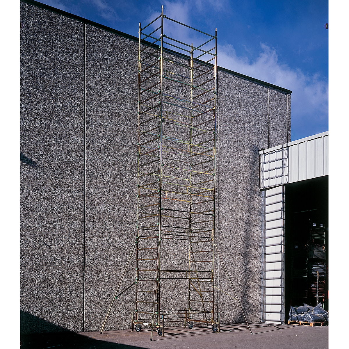 Andamio profesional con estructura tubular de hierro. Sistema modular que permite ir alcanzando más altura a medida que se la van añadiendo más montantes y travesaños. El primer módulo viene equipado con dos travesaños que incluyen 4 ruedas giratorias con freno de pie.