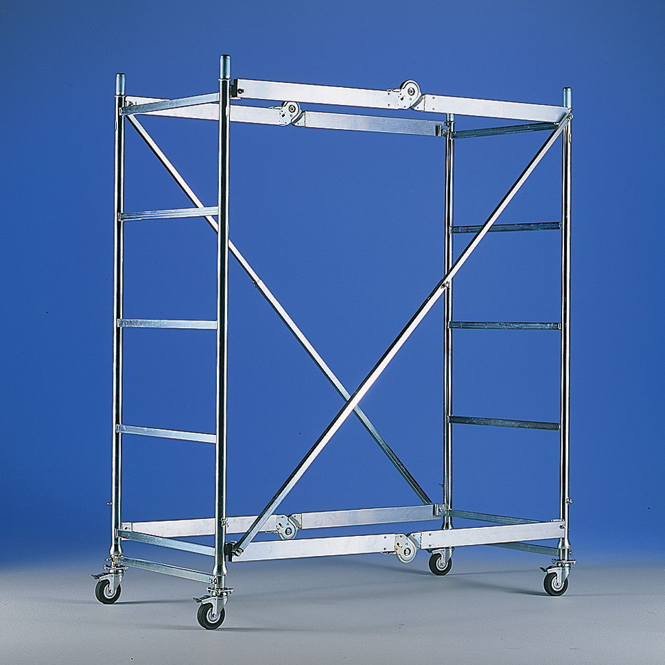 Andamio profesional plegable y telescópico con estructura tubular de hierro. Gracias a su diseño, el andamio se puede plegar reduciendo considerablemente su tamaño.