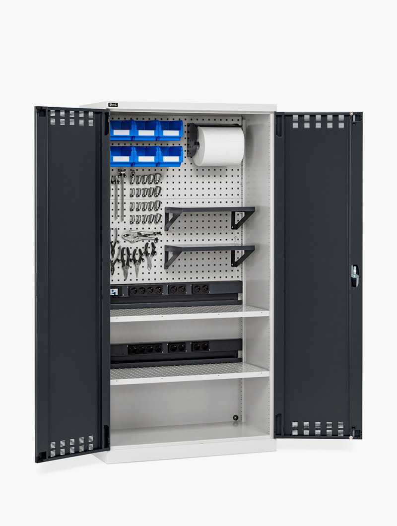 La función del armario depende de los accesorios, elegidos según el uso, que lo convierten en un armario para guardar material, proteger y recargar equipos eléctricos o guardar piezas pequeñas, o en un armario de seguridad antiincendio, de almacenamiento de equipos de protección personal, archivo, etc.