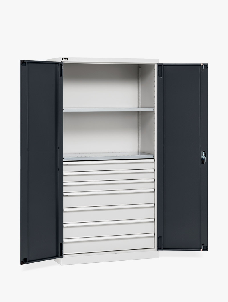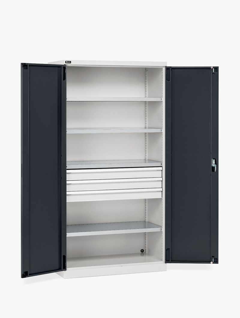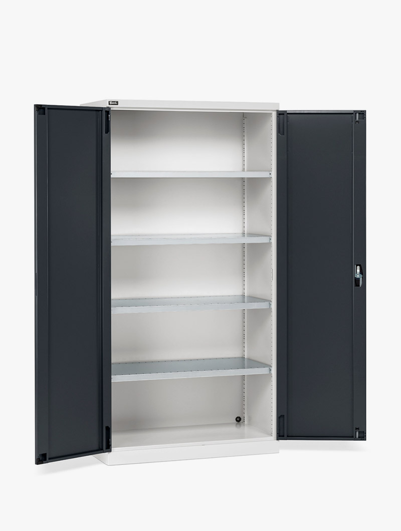 El Armario con puertas batientes Perfom 1023×2000 cuenta con una estructura sólida de chapa de metal y ha sido diseñado para asumir distintas versiones, adaptándose con precisión a las exigencias de cualquier entorno de trabajo profesional.
