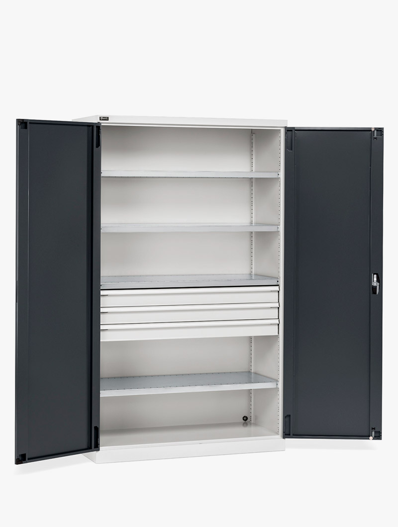 El Armario con puertas batientes Perfom 1193×2000 destaca por su sólida estructura de chapa de metal, diseñada específicamente para soportar las exigencias de un entorno industrial intensivo.