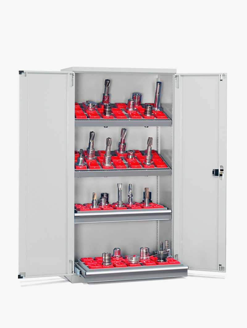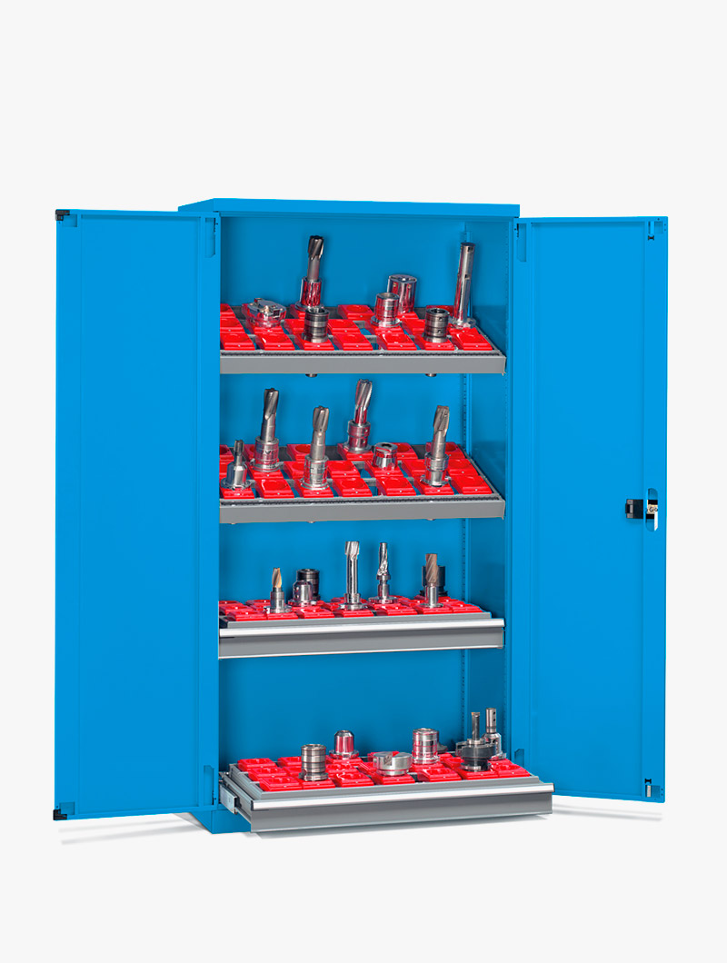 Organización, protección, seguridad y transporte para herramientas CNC: los armarios NC Perfom, disponibles en diferentes soluciones, responden adecuadamente a la logística de los centros de control numérico.