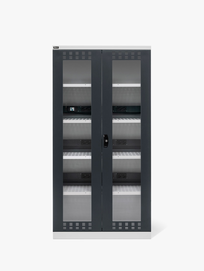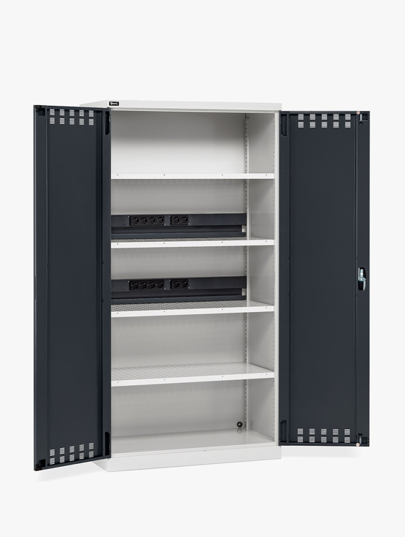 El Armario con puertas batientes y toma de corriente combina una sólida estructura de chapa de metal con una infraestructura eléctrica avanzada.