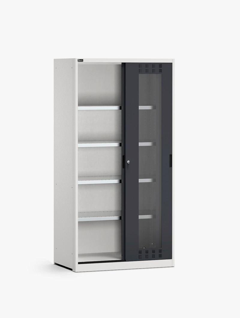 El Armario con puertas correderas Perfom destaca por su estructura sólida en chapa de acero y su diseño inteligente, pensado para ofrecer una solución de almacenamiento de alta capacidad sin invadir los pasillos o zonas de paso gracias a su sistema de apertura deslizante.