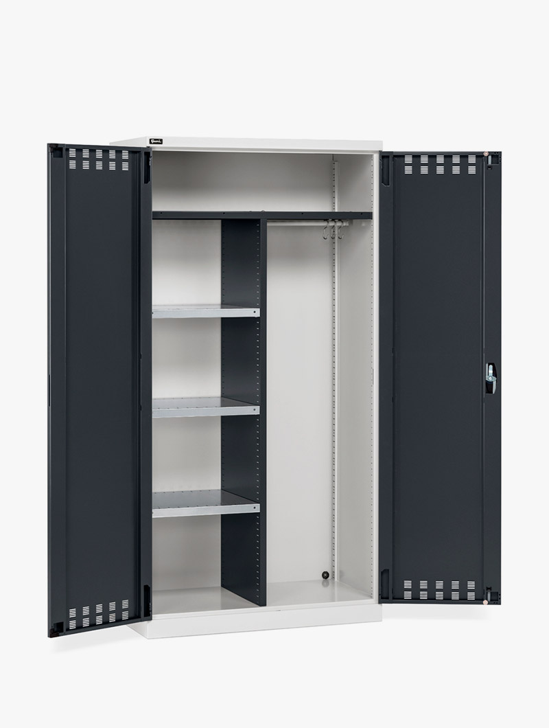 El armario Perfom con puertas batientes tiene una sólida estructura de chapa de metal y ha sido diseñado para asumir distintas versiones (en el momento del pedido o en las fases sucesivas) de acuerdo con los usos y las necesidades.