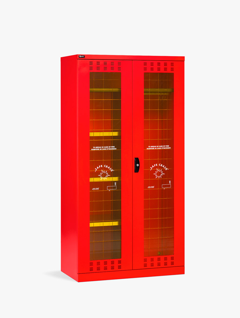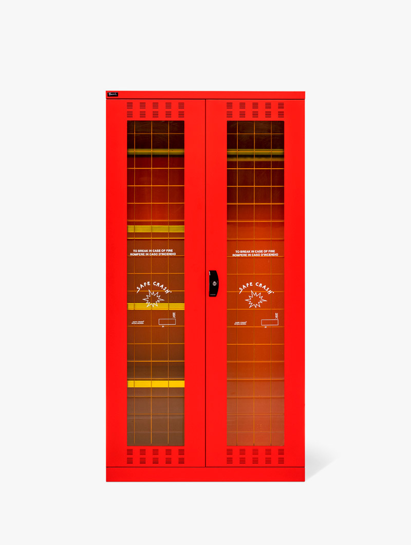 Además, incorpora puertas de plexiglás «safe crash», diseñadas para romperse con facilidad en caso de extrema necesidad, garantizando el acceso inmediato al contenido durante una emergencia.