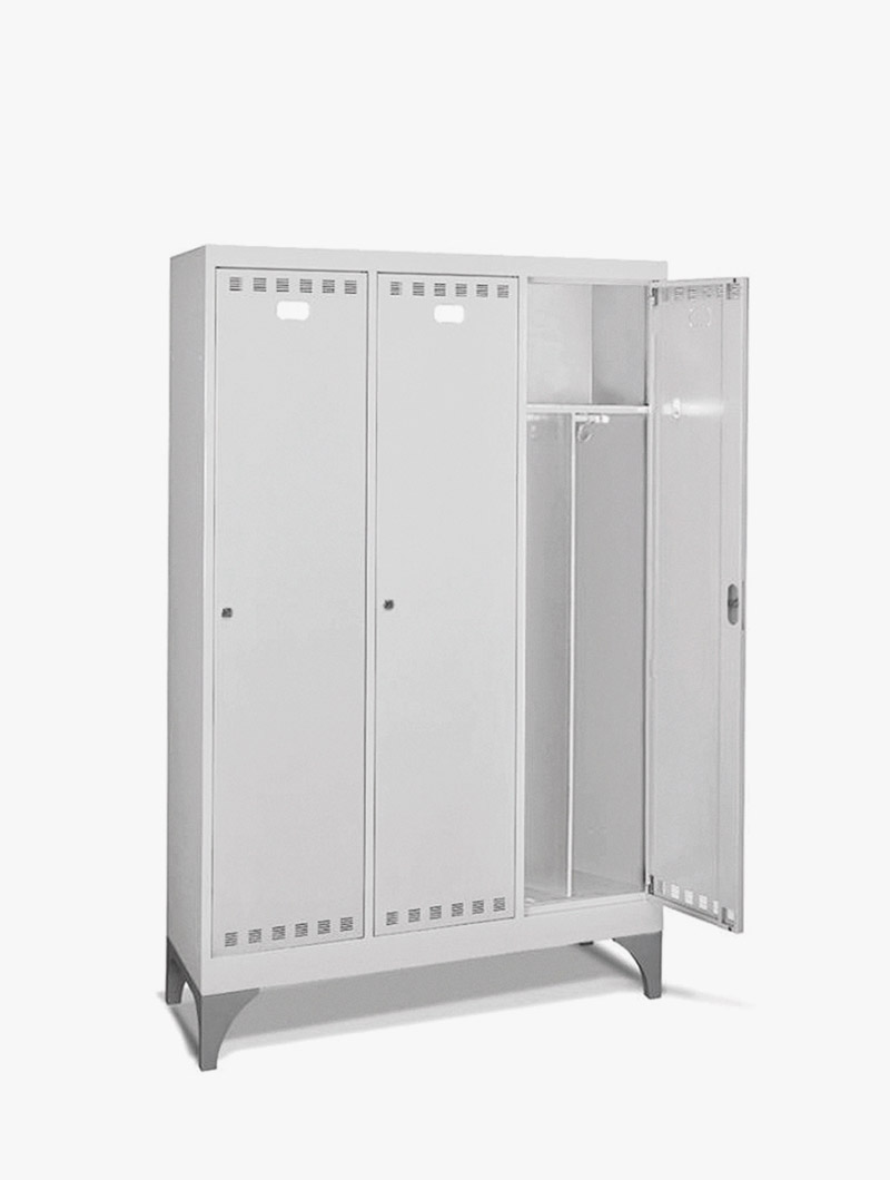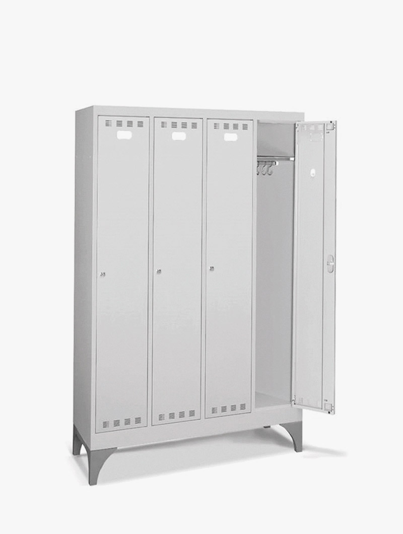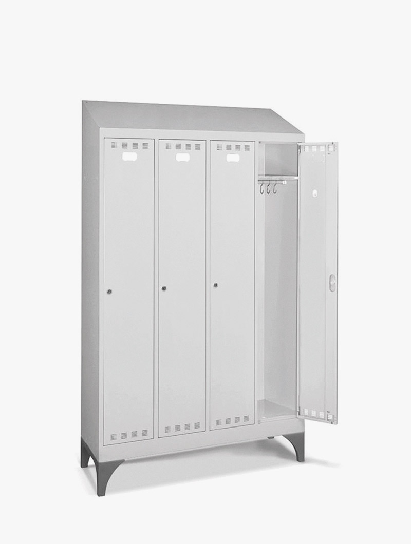 El armario para vestuario con patas Perfom puede tener hasta 4 compartimentos. Según las diferentes necesidades, el techo puede ser horizontal o inclinado; este último, gracias a su inclinación, es más fácil de limpiar y junto con el divisorio limpio/sucio, representa la solucción adecuada para todos los entornos que necesiten estándares de higiene muy precisos. El compartimento interno de las taquillas metálicas para vestuarios puede dividirse por medio de una balda galvanizada, que, en algunos modelos, se puede regular en altura.