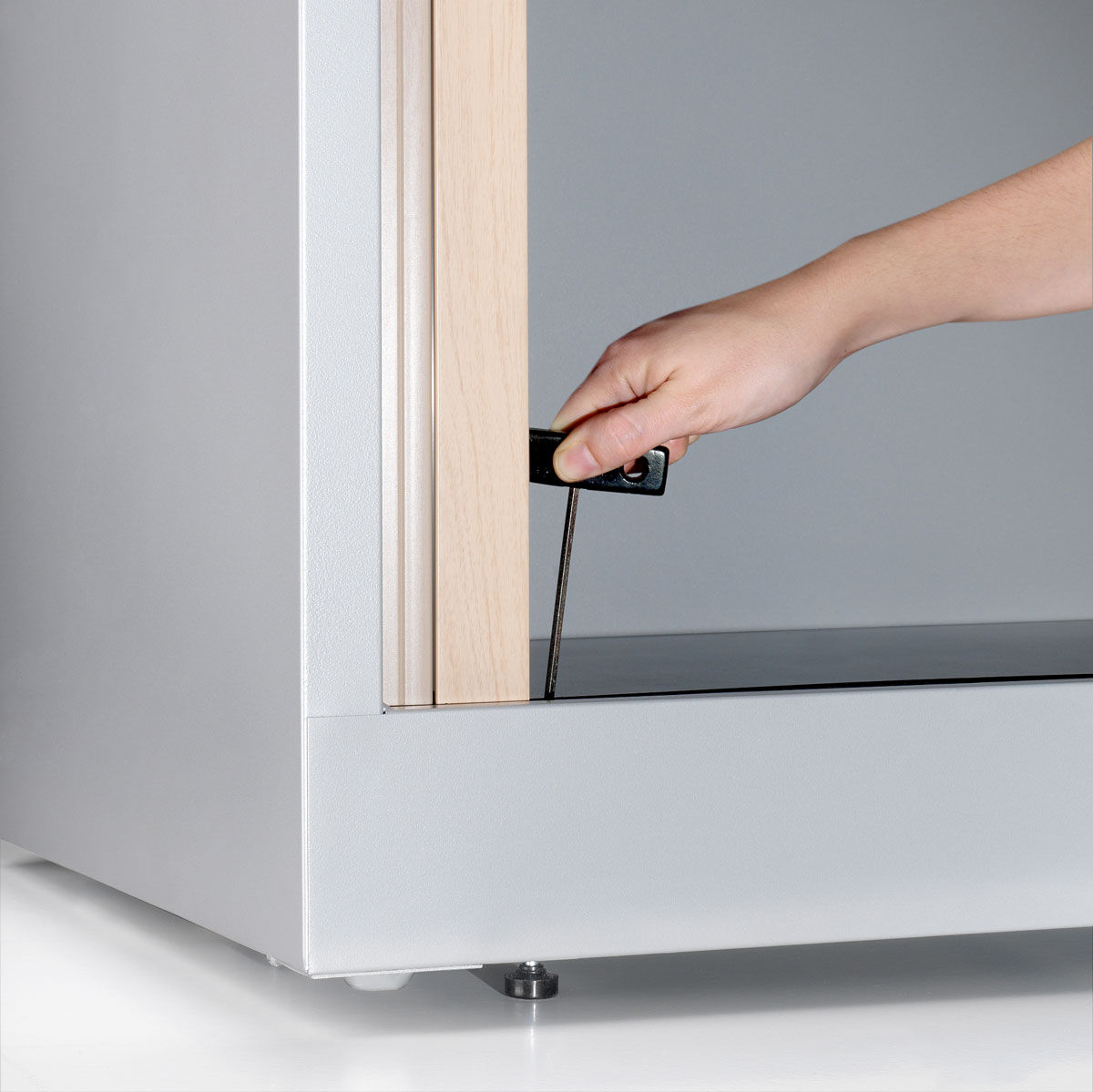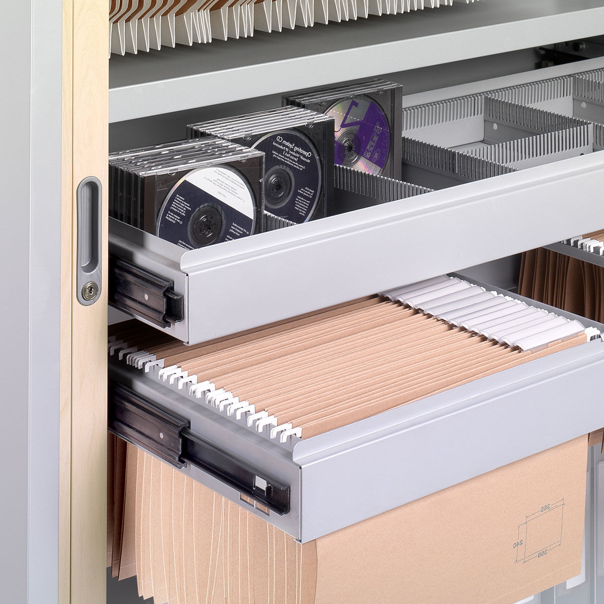 La estructura interna está preparada para poder montar y regular los estantes en altura y para carpetas colgantes formato DIN A4. Los armarios se entregan sin estantes. Pida los estantes que necesite para configurar el armario según sus necesidades.