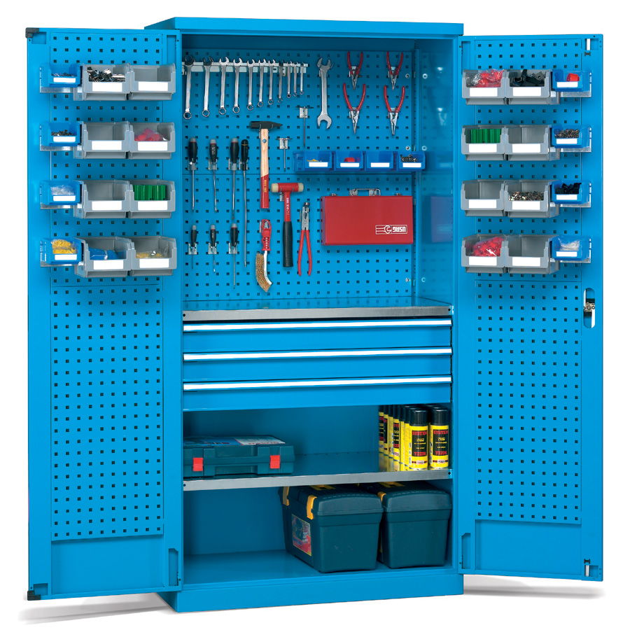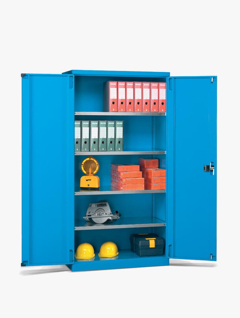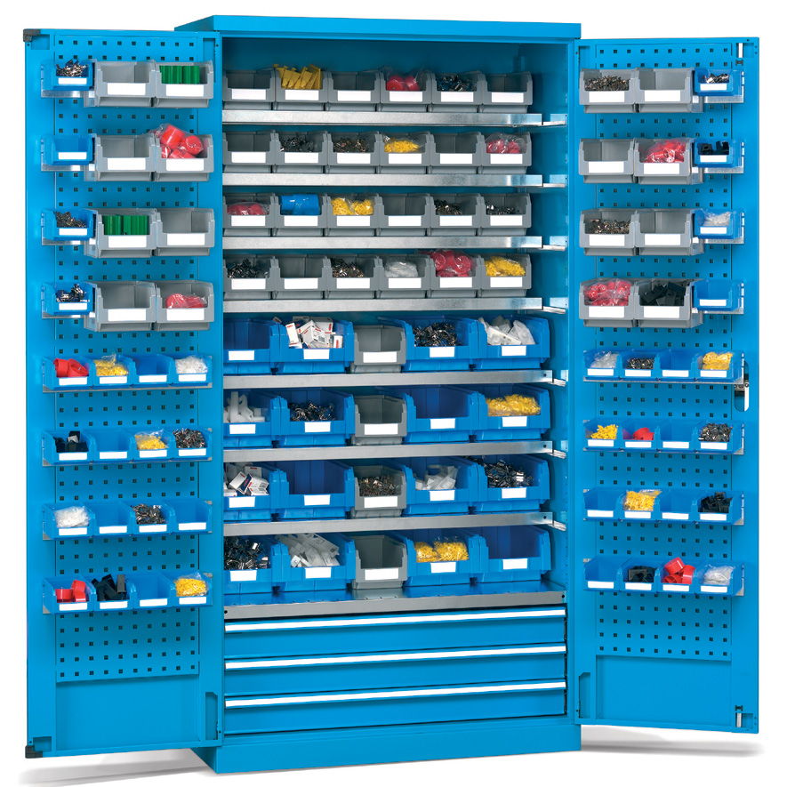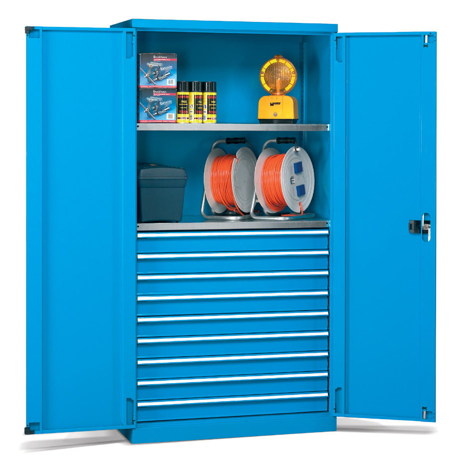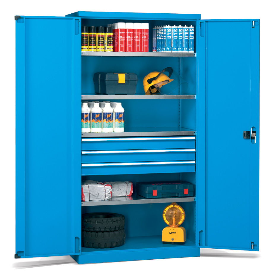 Los armarios metálicos para taller y oficina con cajones y puertas batientes de distintas medidas configuran un grupo de armarios pensados para el almacenaje y la custodia de elementos de pequeñas o medianas dimensiones y de pesos medios.