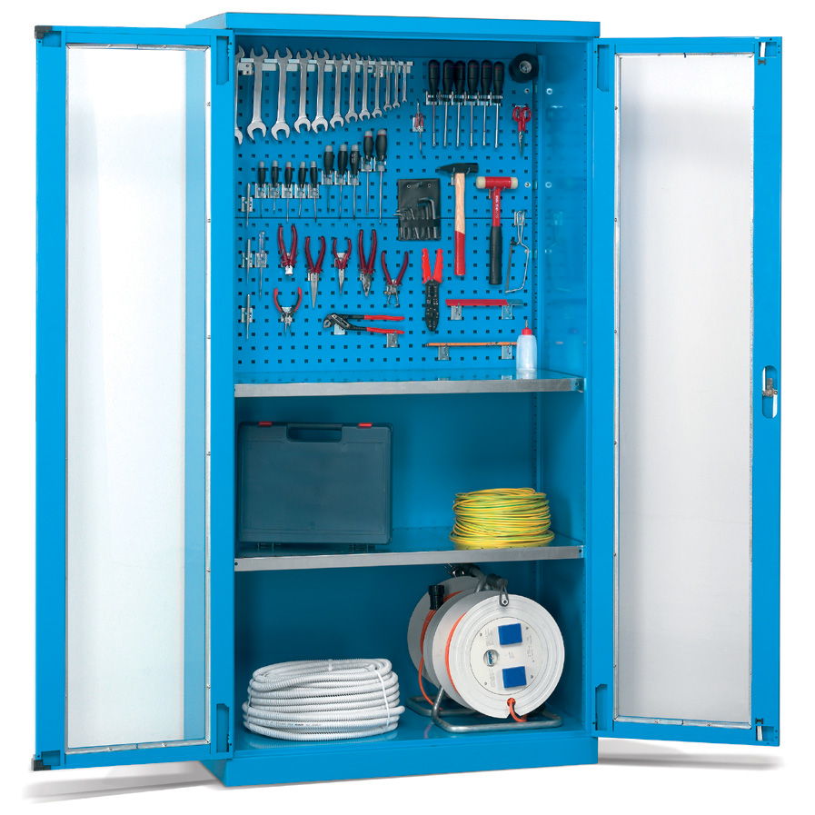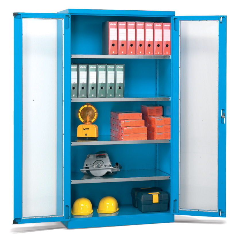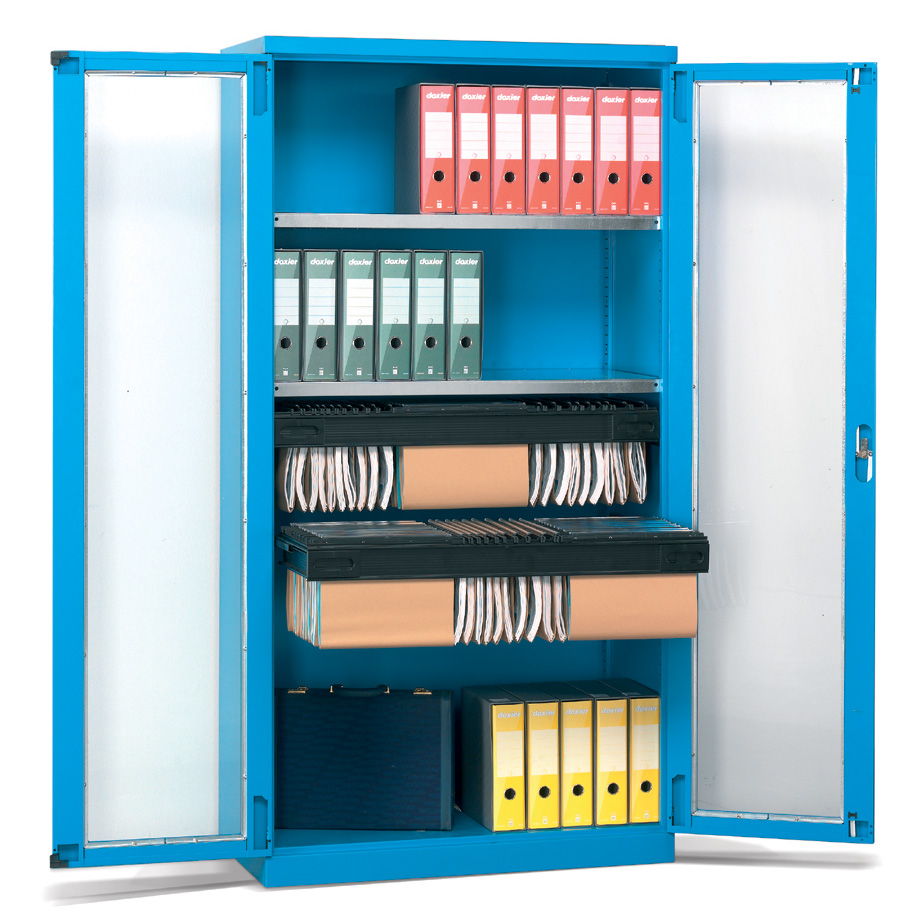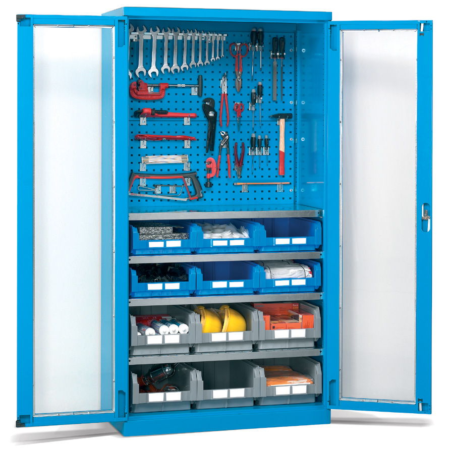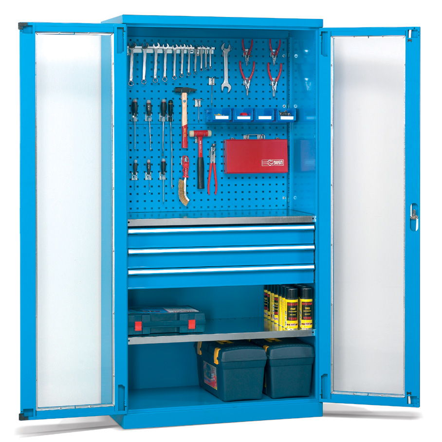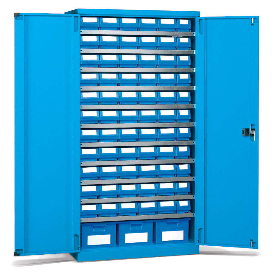 Los armarios metálicos para taller y oficina con cajones y puertas batientes de distintas medidas configuran un grupo de armarios pensados para el almacenaje y la custodia de elementos de pequeñas o medianas dimensiones y de pesos medios.