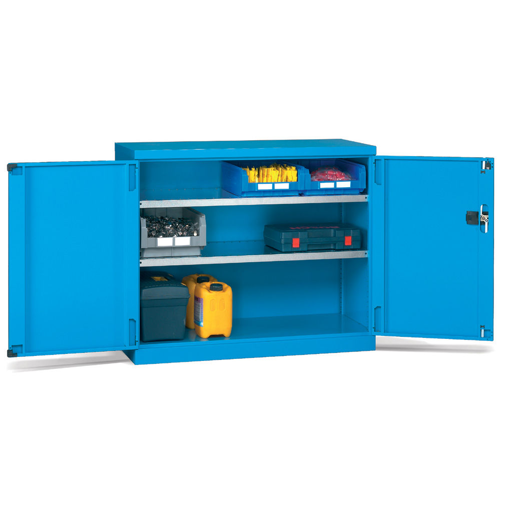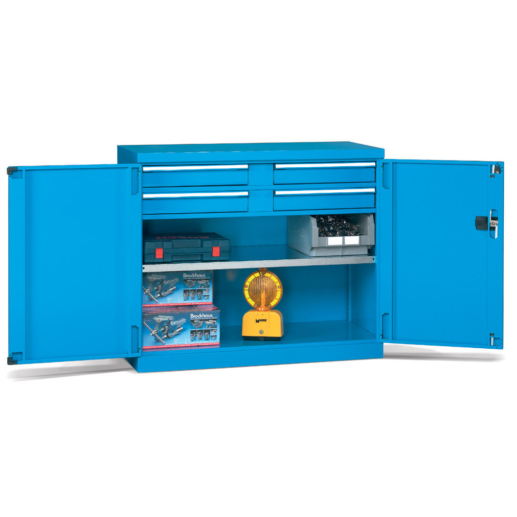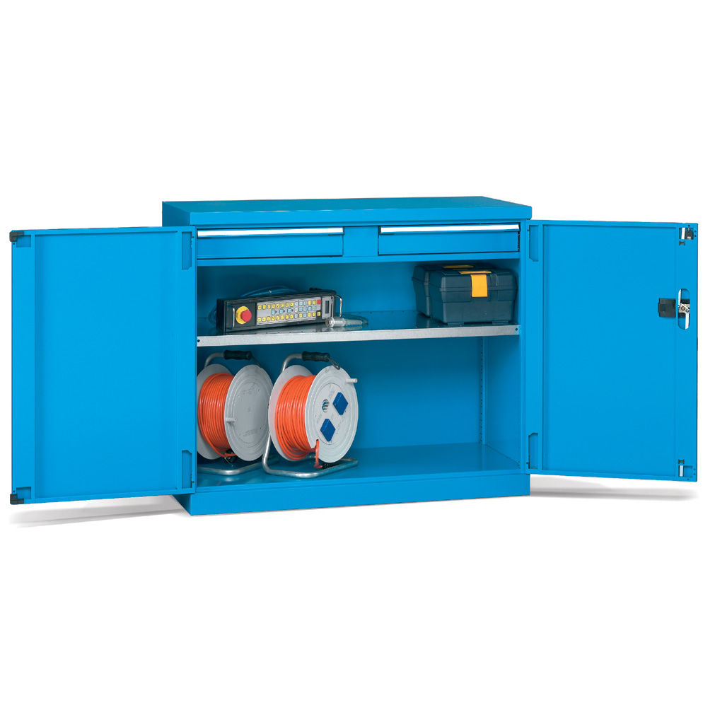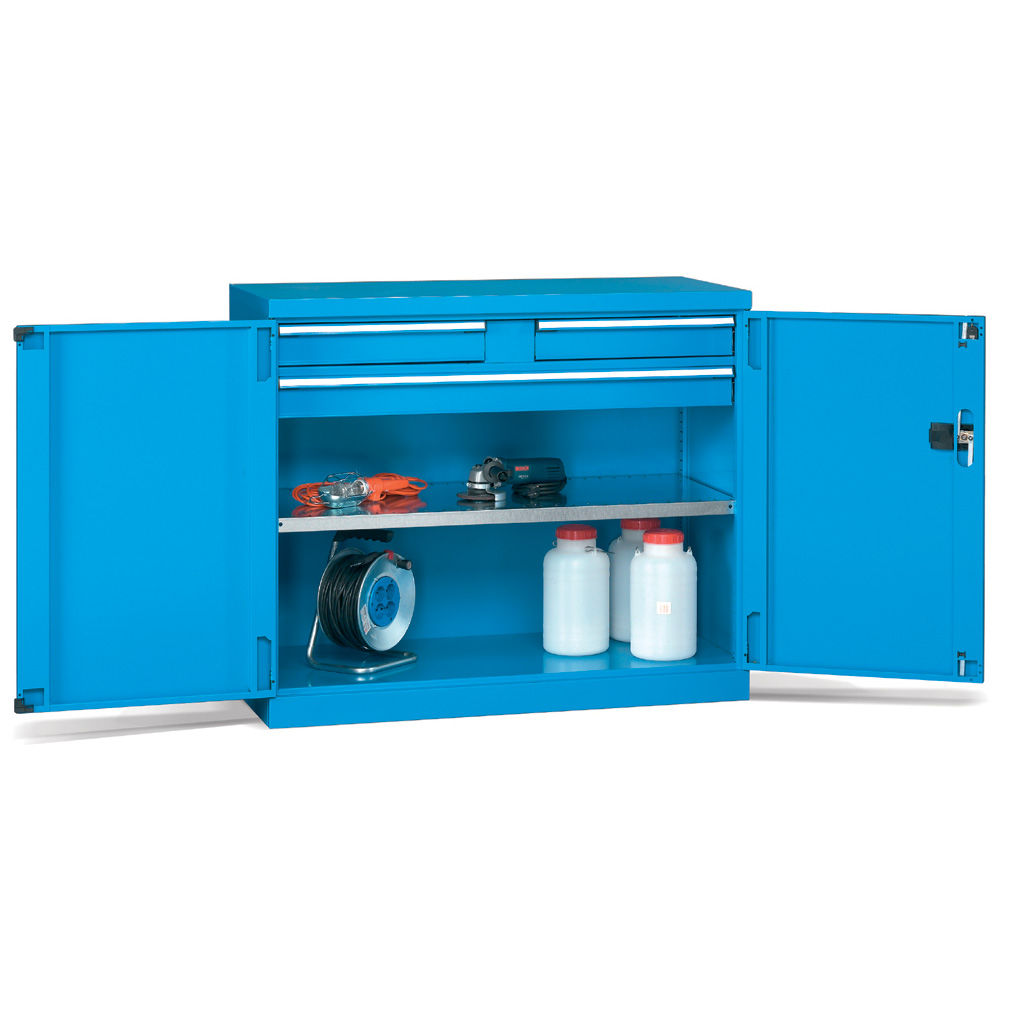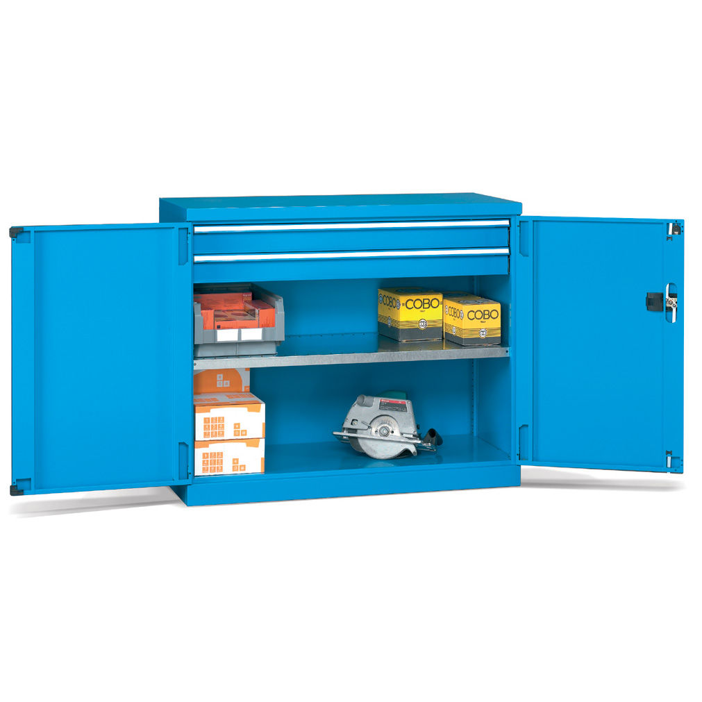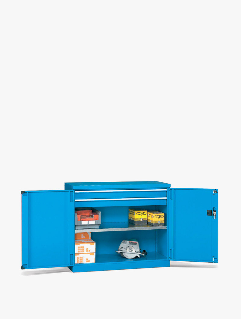 Los armarios metálicos para taller y oficina con cajones y puertas batientes de distintas medidas configuran un grupo de armarios pensados para el almacenaje y la custodia de elementos de pequeñas o medianas dimensiones y de pesos medios.