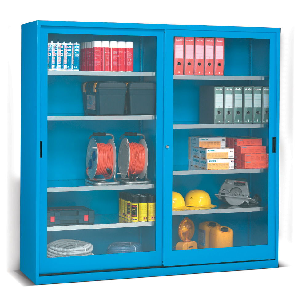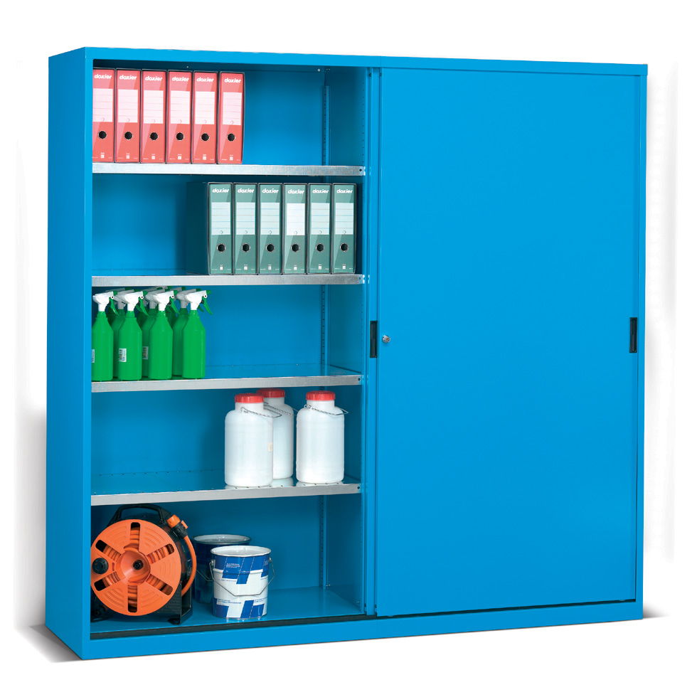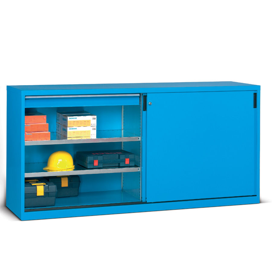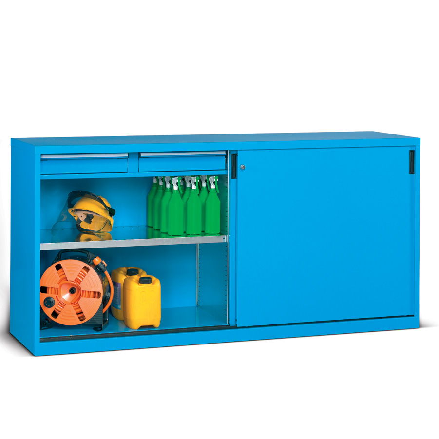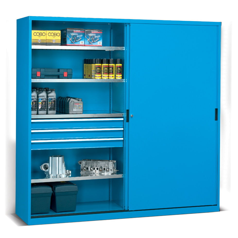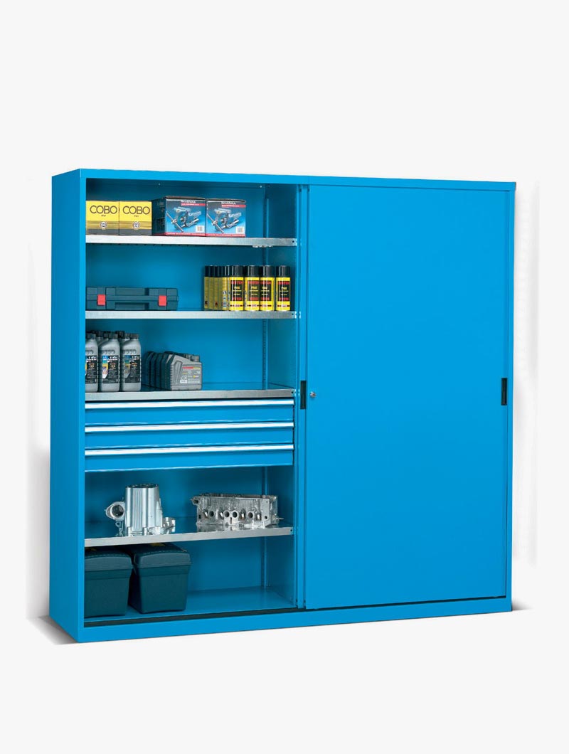 Los armarios metálicos para taller y oficina con cajones y puertas correderas de distintas medidas configuran un grupo de armarios pensados para el almacenaje y la custodia de elementos de pequeñas o medianas dimensiones y de pesos medios.