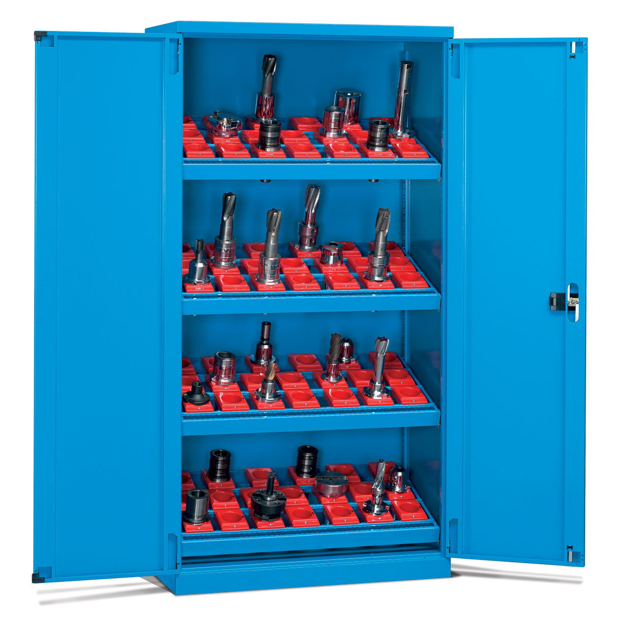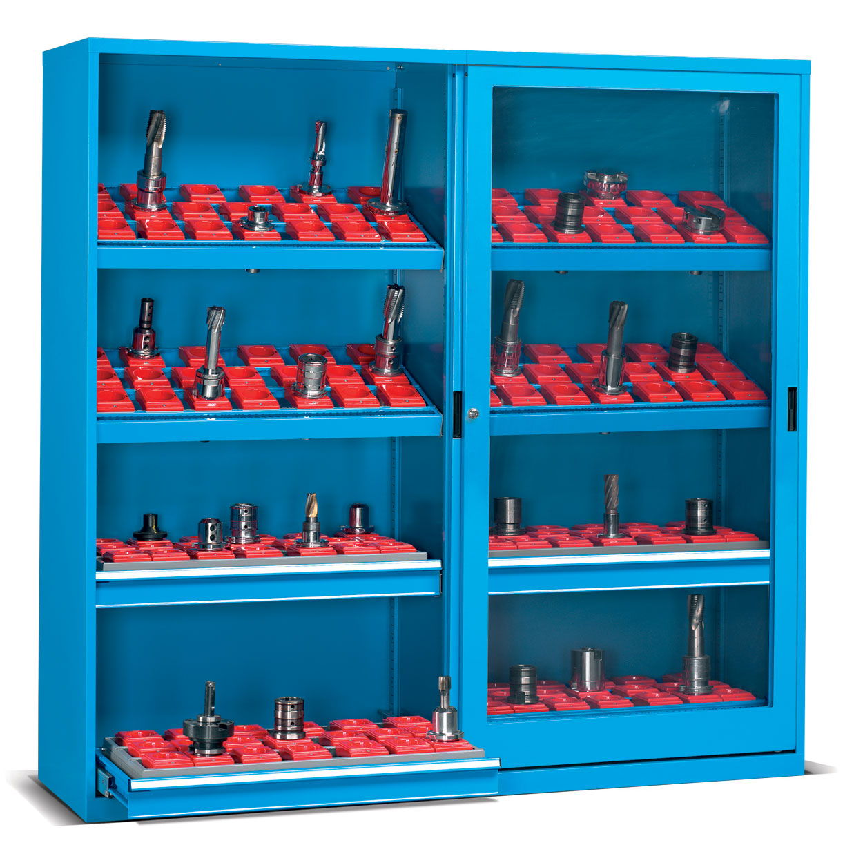 Gracias a sus paneles laterales perforados, es posible configurar la altura y posición de los cajones o las bandejas fijas con total libertad. Además, el sistema es compatible con los soportes porta-herramientas de la mayoría de fabricantes del mercado, incluyendo estándares como ISO, HSK, CAPTO o VDI.