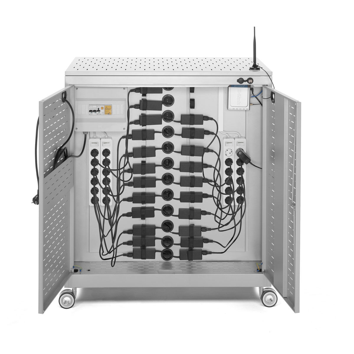 Los armarios para ordenadores portátiles son un elemento indispensable para escuelas, aulas de formación y otros lugares donde haya un buen número de ordenadores portátiles. Su estructura monobloque de chapa de acero le proporcionan una resistencia y una robustez muy elevadas.