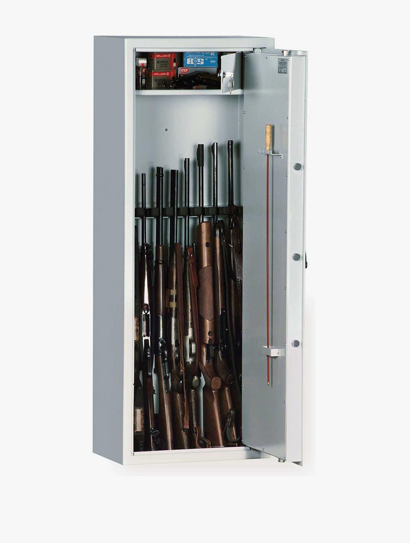 Modelos para almacenar entre 5 y 11 armas. Bastidor de pared individual y puerta de doble pared de 60mm de grosor con pestillos en 3 lados.
