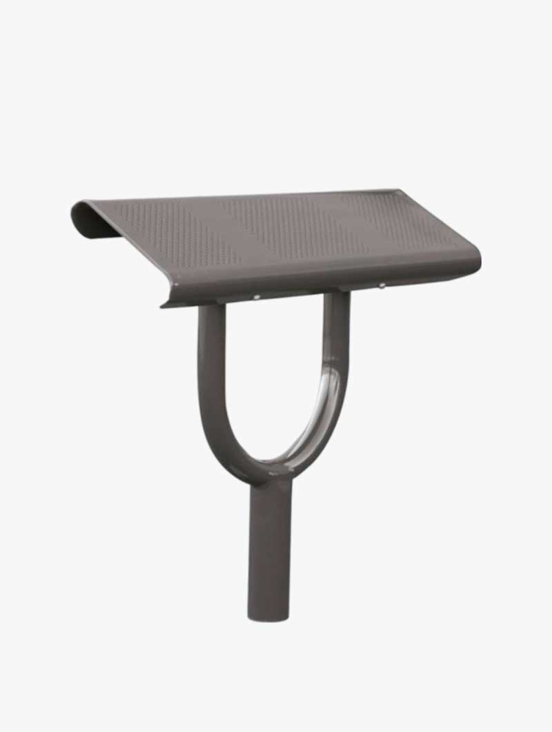 Banco isquiático con poste de tubo de acero de 76 mm. Asiento de chapa de acero perforado de 2,5 mm, pliegues aplanados y ángulos redondeados de seguridad en los extremos.
