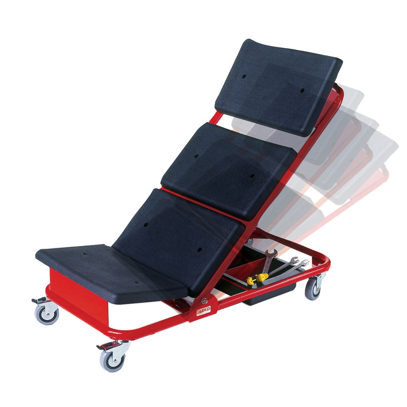 Especialmente bueno para el trabajo en máquinas o motores más grandes. El asiento y los cojines son de espuma de poliuretano. Regulación continua del respaldo de 5° a 75° mediante dos pistones a gas. Reposacabezas ajustable.