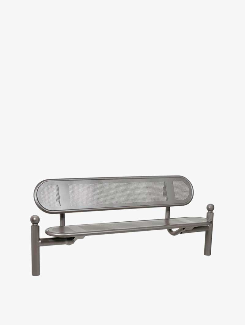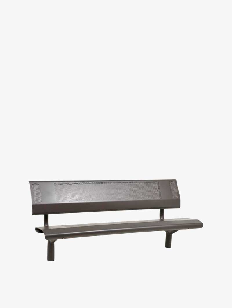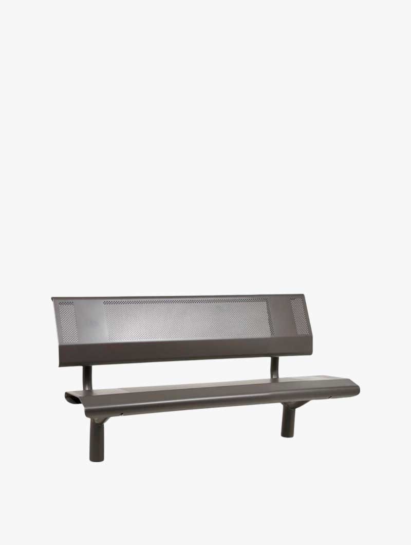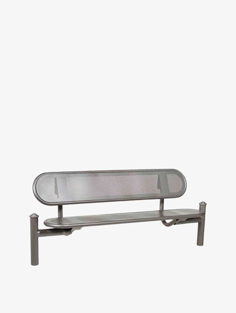 Un modelo discreto pero elegante, cuya estructura de acero garantiza la estabilidad. Gracias a su diseño atemporal, se integra en cualquier entorno. Estructura de tubo de acero de Ø 76 mm. Asiento y respaldo en chapa de acero perforado de 2,5 mm, pliegues aplanados y ángulos redondeados de seguridad en los extremos.