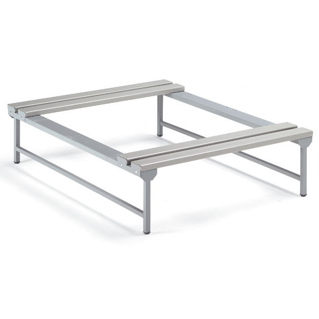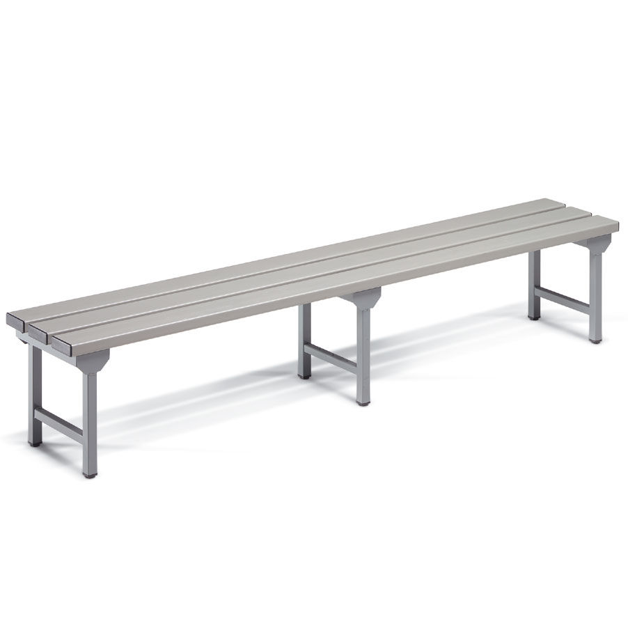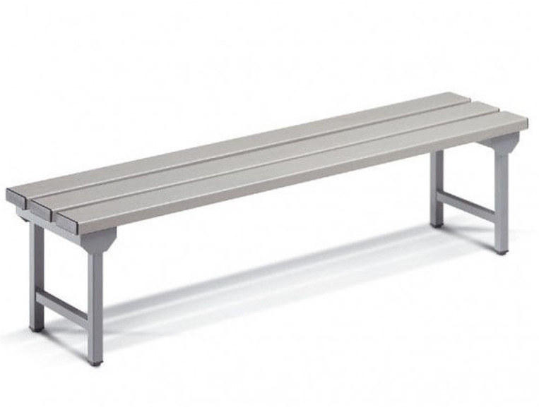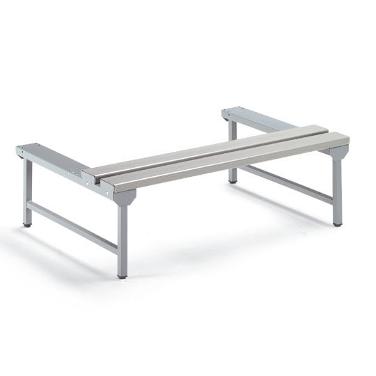 Bancos de vestuario realizados en acero y listones de plástico con patas ajustables.
