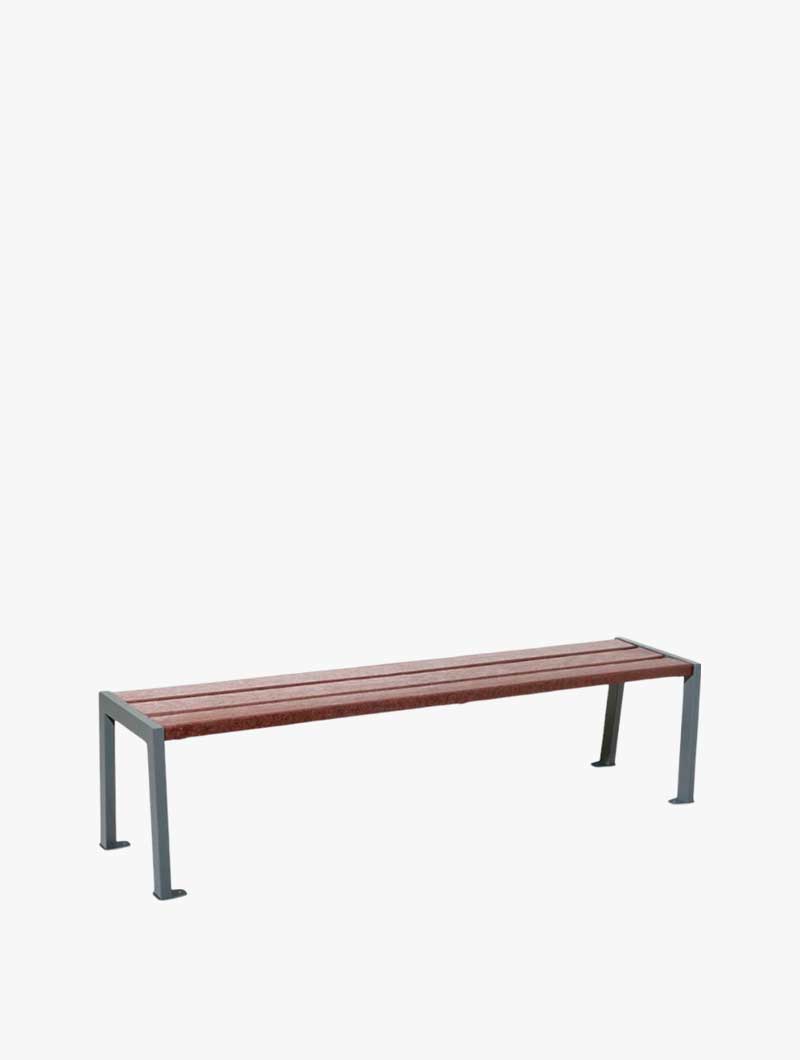 Estructura de acero 80 mm de ancho, 8 mm de espesor, pintura sobre zinc según nuestra gama de colores. Asiento de plástico reciclado de 40 mm de espesor y reforzado con una armadura de acero galvanizado.