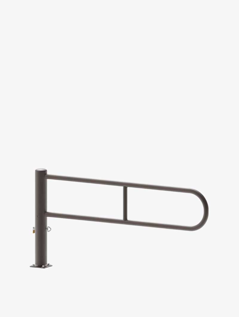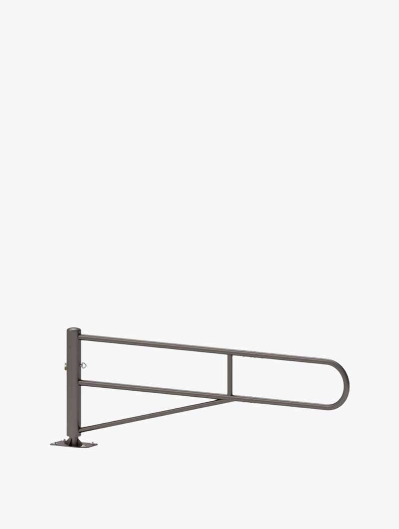 Estructura de tubo de acero de ø 60 mm. Cierre mediante pasador ø 20 mm y candado (suministrados), bloqueo posible a 90º en posición abierta. Acabado galvanizado o pintura sobre galvanizado según nuestra gama de colores.