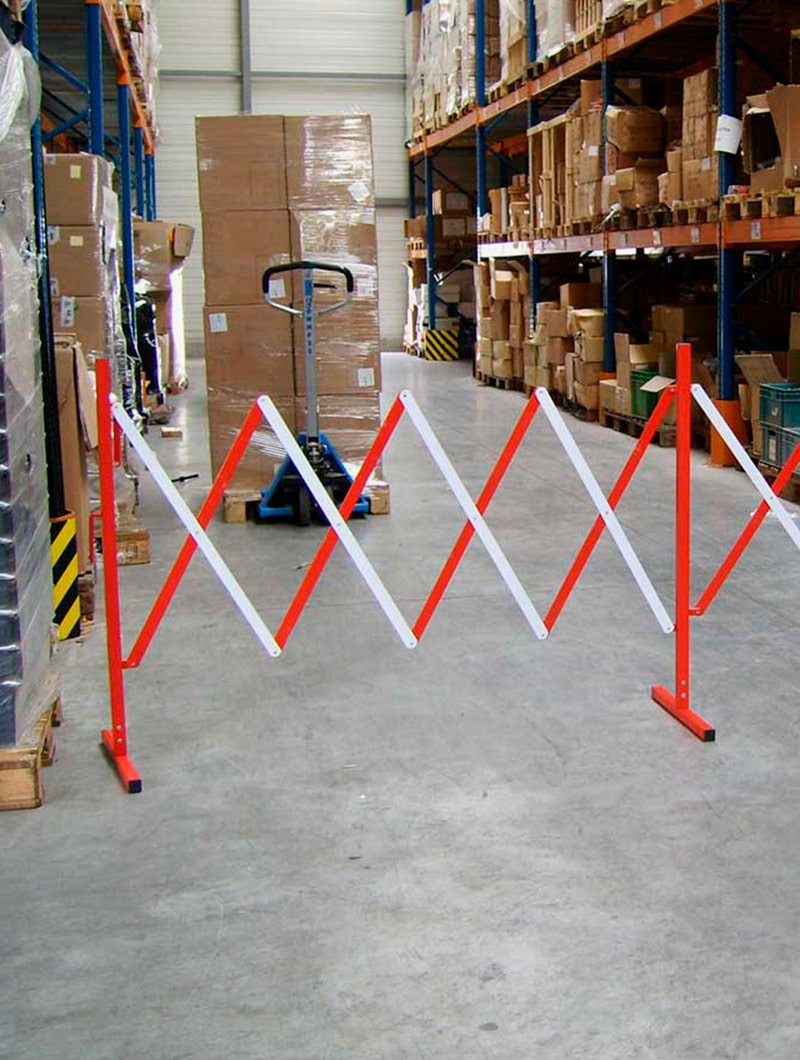 Barrera de pantógrafo ligera fabricada en acero con acabado en pintura epoxy con tratamiento contra los rayos ultra-violetas. Disponible en dos combinaciones de colores de alta visibilidad. Se le pueden instalar ruedas y  porta señales de manera opcional.