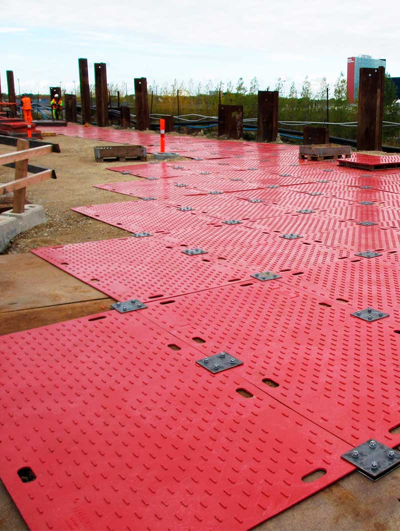 Cada módulo de la carretera temporal para vehículos se une fácilmente mediante conectores resistentes, creando un sistema continuo y seguro que soporta cargas de hasta 80 toneladas. Su instalación es rápida y sencilla, sin necesidad de maquinaria especial, y su limpieza y mantenimiento resultan muy fáciles gracias a su composición no porosa.