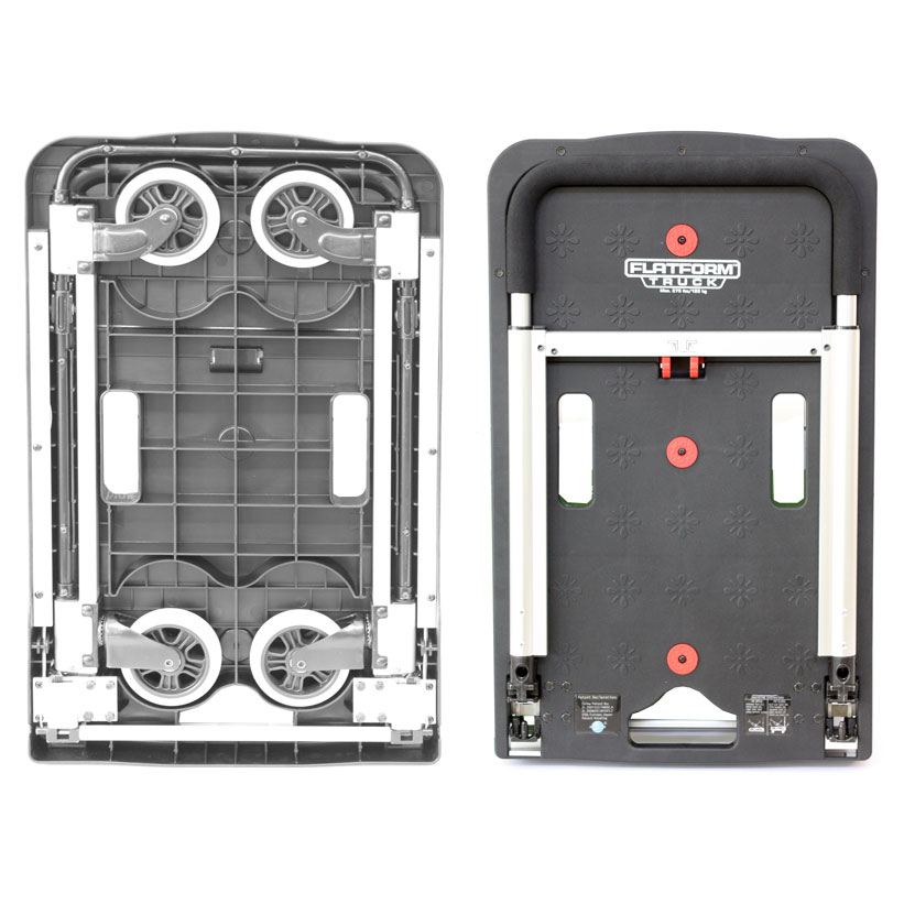 Carretilla plegable compacta. Se abre y cierra en segundos. Fácil de usar y almacenar. Fabricado en aluminio de bajo peso y alta durabilidad. Se entrega 100% ensamblado. Manejadores ergonómicos. Base de aluminio: 59 x 39 cm. Ruedas giratorias de caucho de 20 cm. Peso neto: 10,5 Kg.