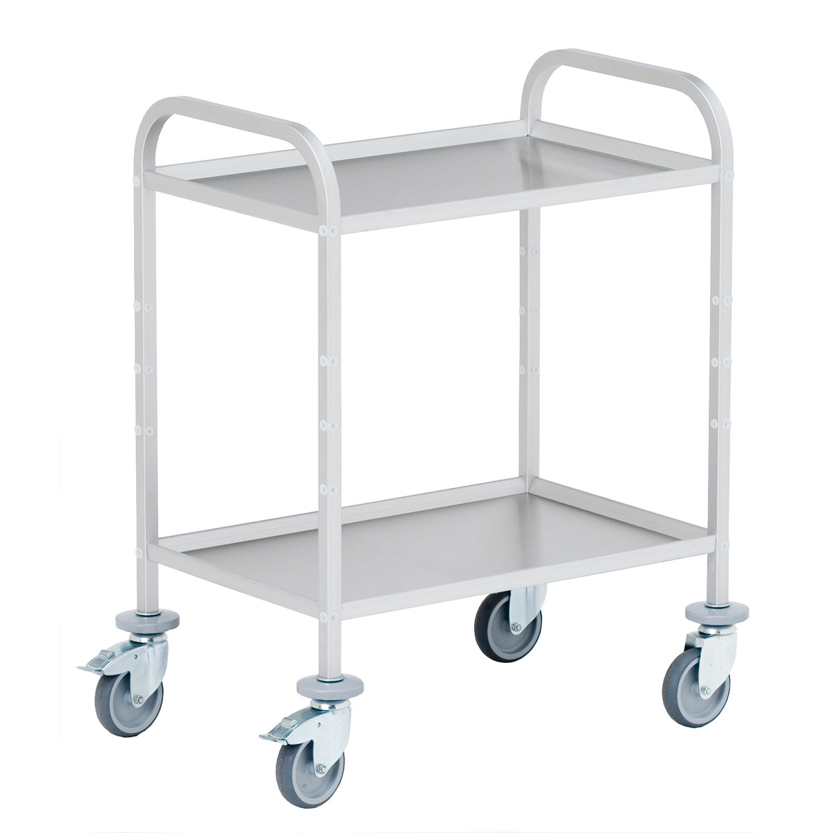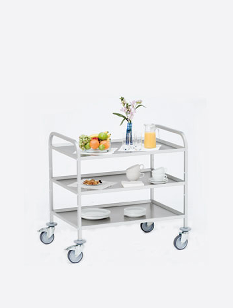 Los carritos de servicio están fabricados de forma modular, se puede elegir entre 2,3 o 4 bandejas regulables en 5 posiciones en altura. Las bandejas están disponibles en dos opciones: aluminio o en acero inoxidable. Dispone de cuatro ruedas giratorias de 100mm o 125mm Ø en goma termoplástica anti huellas, dos de ellas disponen de freno. Ideales para la utilización en la hostelería, lavanderías, hospitales, residencias, etc… Gracias a sus dos tiradores ergonómicos facilitan el manipulado dentro de las instalaciones del cliente. Se suministran desmontados.