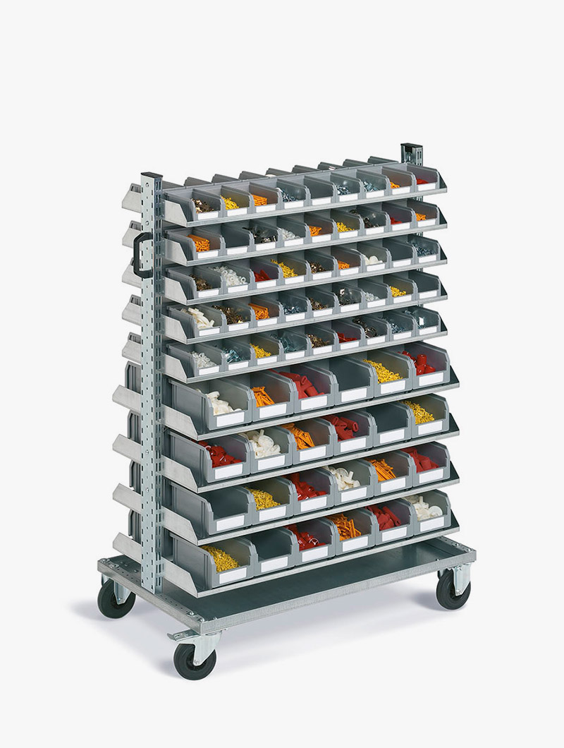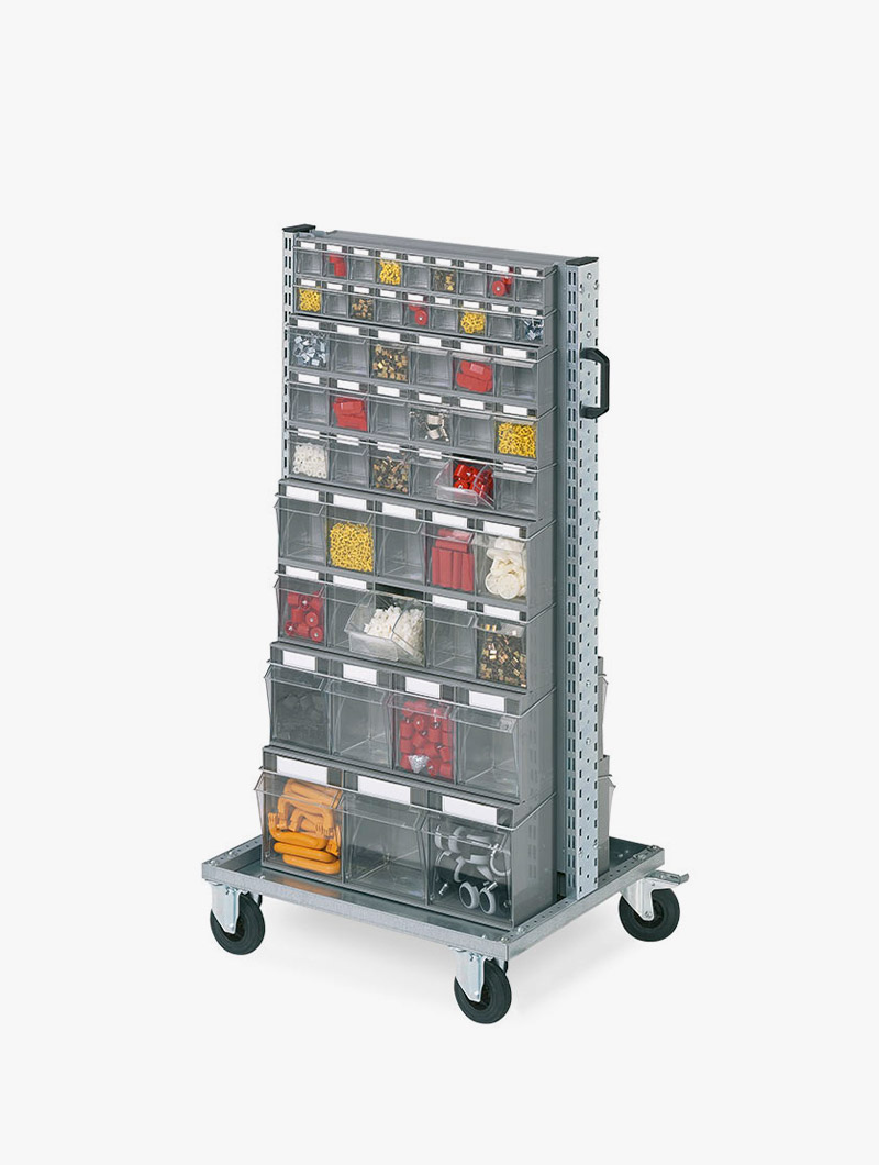 Diseñados para la catalogación y transporte de piezas pequeñas, los carros para piezas pequeñas están hechos de chapa de acero pintada en tonos grises oscuros y galvanizado y tienen una estructura muy ágil, modular y personalizable en el tiempo.