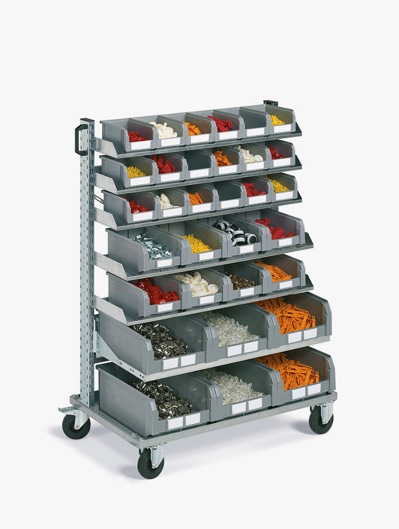 Carros para piezas pequeñas con contenedores de plástico, la solución ideal para el transporte y almacenamiento de materiales de dimensiones medianas-pequeñas (piezas pequeñas, piezas de repuesto, material eléctrico, etc.).