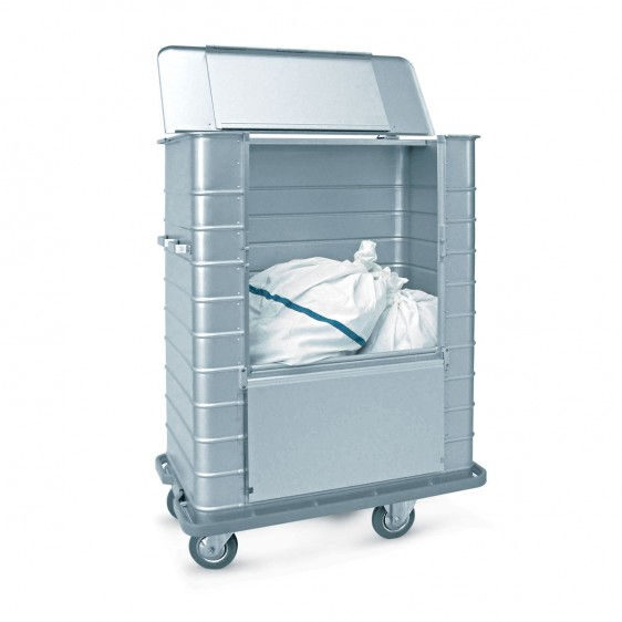 El carro de aluminio con apertura lateral tiene una estructura fabricada completamente en aleación ligera de aluminio anodizado. Este tipo de carros están especialmente diseñados para transportar internamente todo tipo de ropa sucia desde las diferentes estancias del hospital a la lavandería. Protector de PVC integrado en la base del contenedor para minimizar los posibles golpes con paredes y puertas. Paredes nervadas para aportar una mejor robustez. Ruedas de goma gris antihuella de diámetro Ø160 mm. Pared lateral con ventana para facilitar el llenado.
