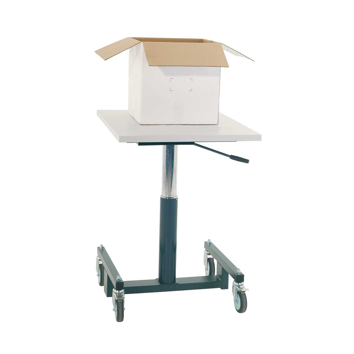 Con palanca neumática para trabajar en función de la altura necesaria para facilitar el manipulado. Incluye 4 ruedas para su transporte.