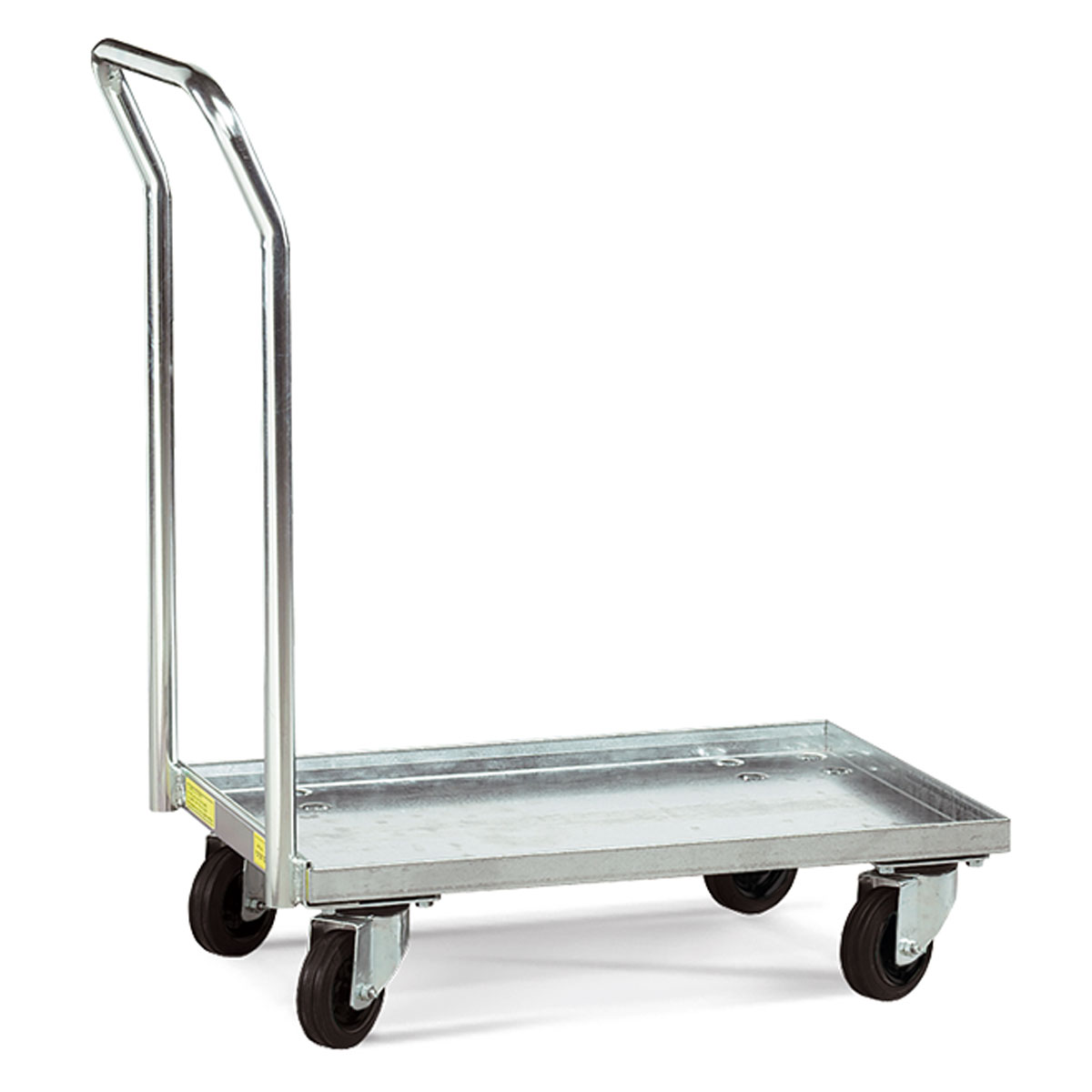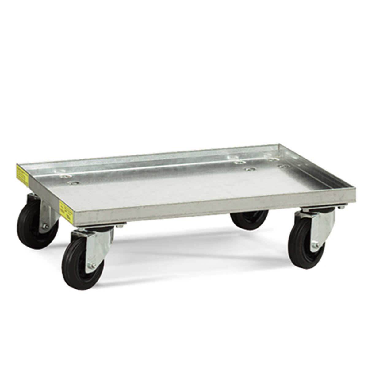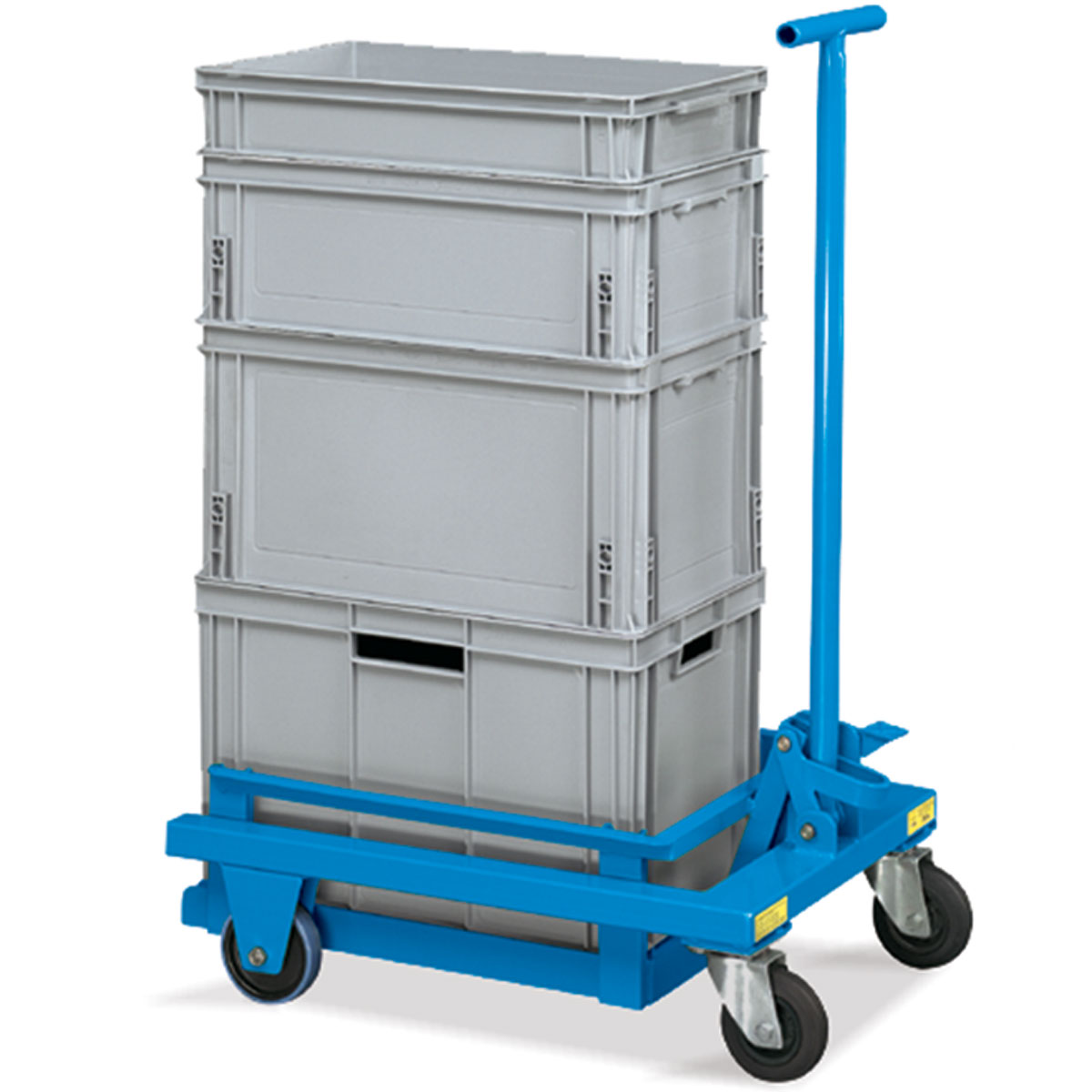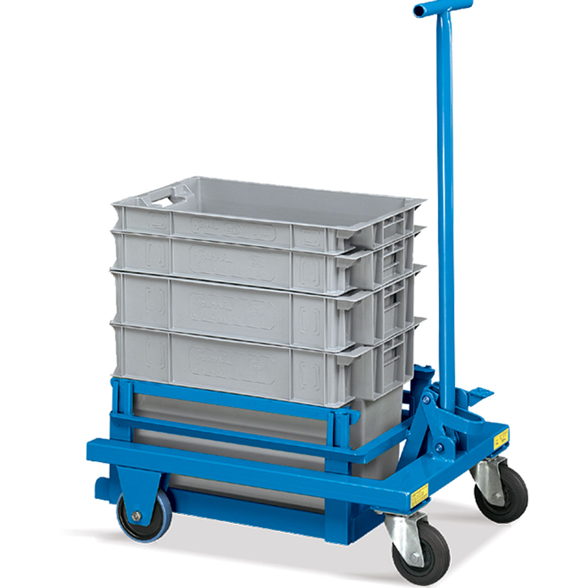 Carro para cajas con ruedas delanteras giratorias y ruedas traseras fijas. Con sistema de elevación de las cajas a nivel de suelo mediante mecanismo de tijera. Disponibles en Ø100 y 125 mm. Fabricadas en goma o poliuretano.